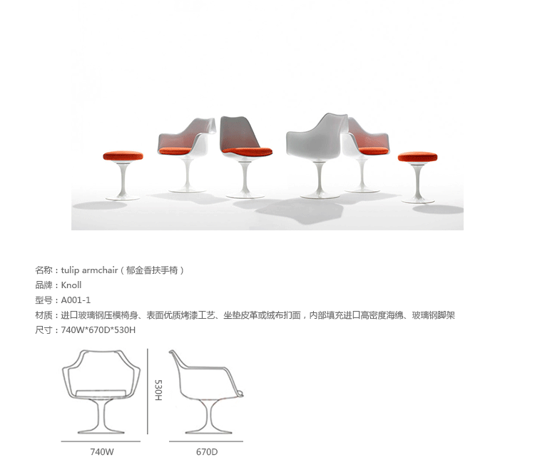 沙里宁郁金香扶手椅设有铸铝底座。外壳是用增强玻璃钢材料完成。座垫是可以可拆卸更换的,有拉链锁扣。