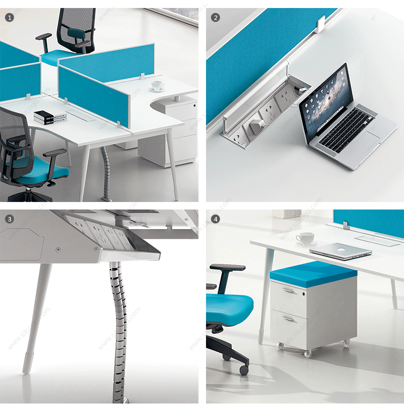 | 1、桌面吸音隔板,多种选择:板材、玻璃、亚克力、吸音板; | 2、整齐划一、人性方便的桌面铝合金过线系统; |