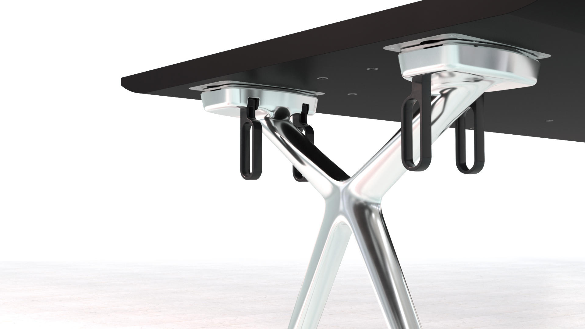 这款Conference-X最大的亮点就是:桌子腿是可以将两个桌面一起快速而轻松地结合在一起,而不需要借助任何工具。而这个专利技术的的连接关键是:桌子腿顶部处在固定锁,桌底有锁扣,以此保证绝对安全和稳定。这也很好的解决了会议台的多样性:从个人的工作桌到成排的会议桌,桌子形状、大小、都可以通过脚架来进行拼接.