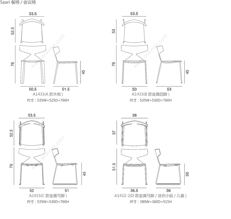 Saya 餐椅/会议椅 系列尺寸/示意图