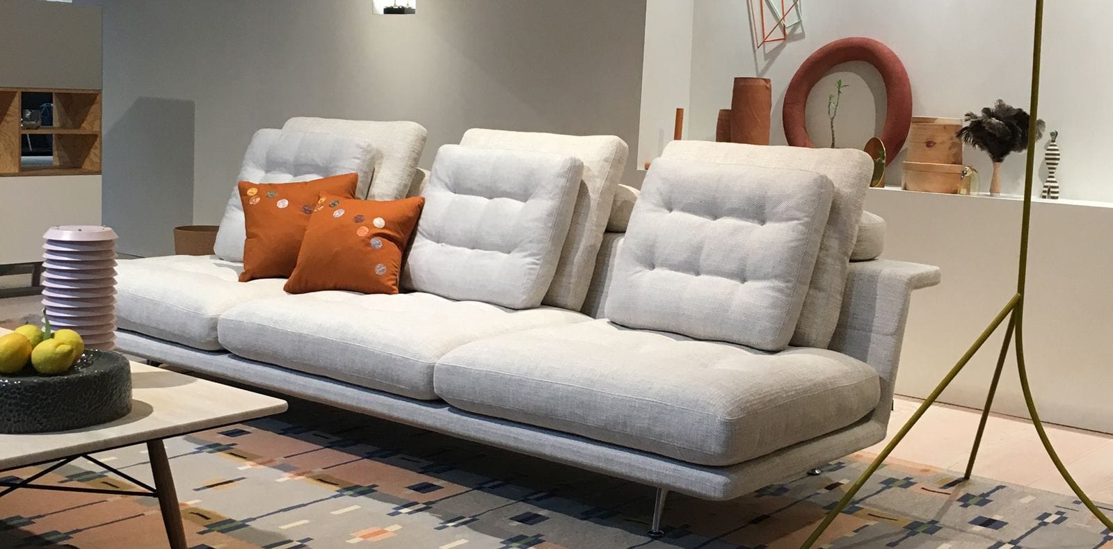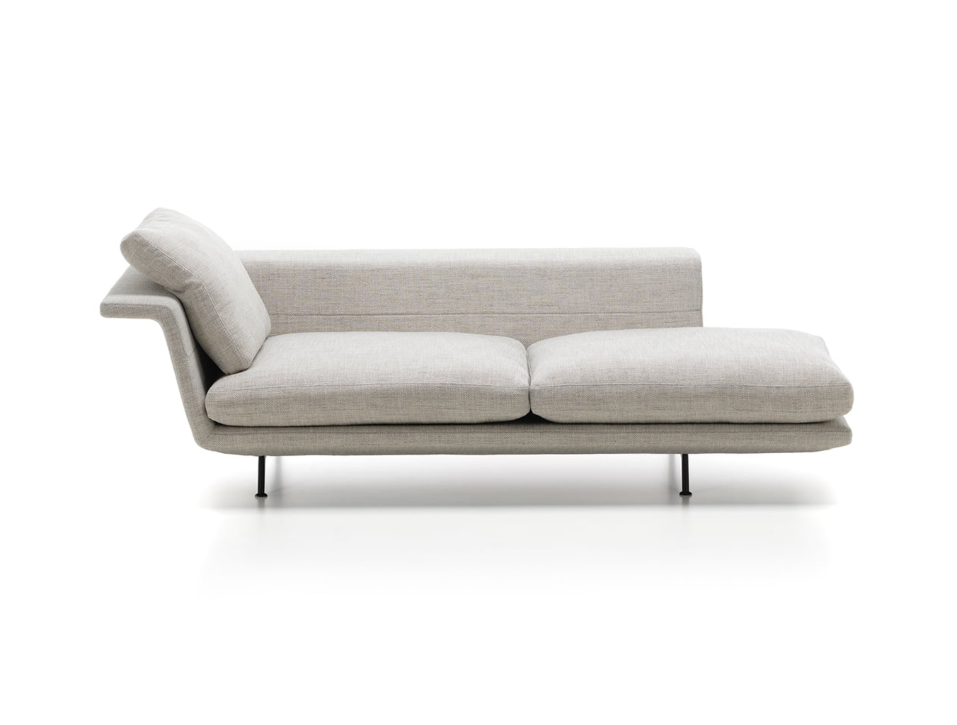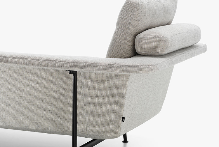 宽大的线条和几何形状的宽大沙发元素营造出宽敞的坐姿或斜倚平台。尽管比例广泛,Grand Sofa仍然拥有优雅的轮廓:纤细的织物覆盖的身体呈双重角度,形成一个层叠式座椅,靠背和后部壁架。车身在座椅表面的每个端部下方的两个点处以及靠背后面由桥状铝基座框架支撑,使得沙发看起来漂浮在地板上方。座椅元素两侧开放,强调GrandSofà的水平面。消费者可以选择全长靠背或缩短版本。这使得可以生产具有间隙和视点的大型座椅布置 - 具有几乎地形特征的沙发景观,传达轻盈和可变性的表达。