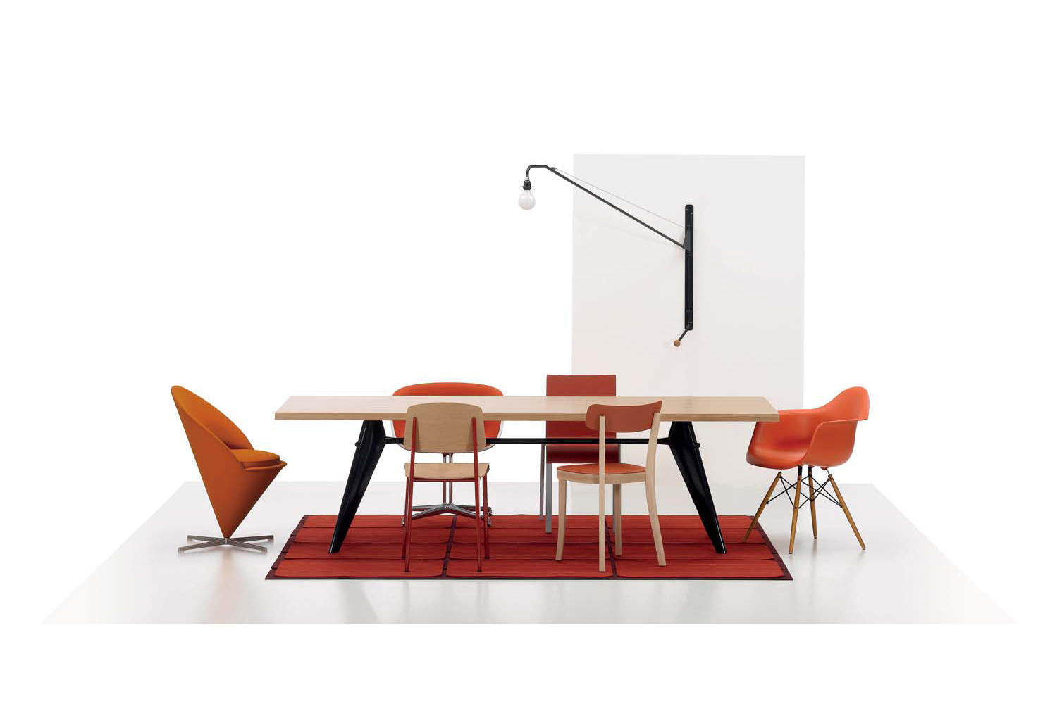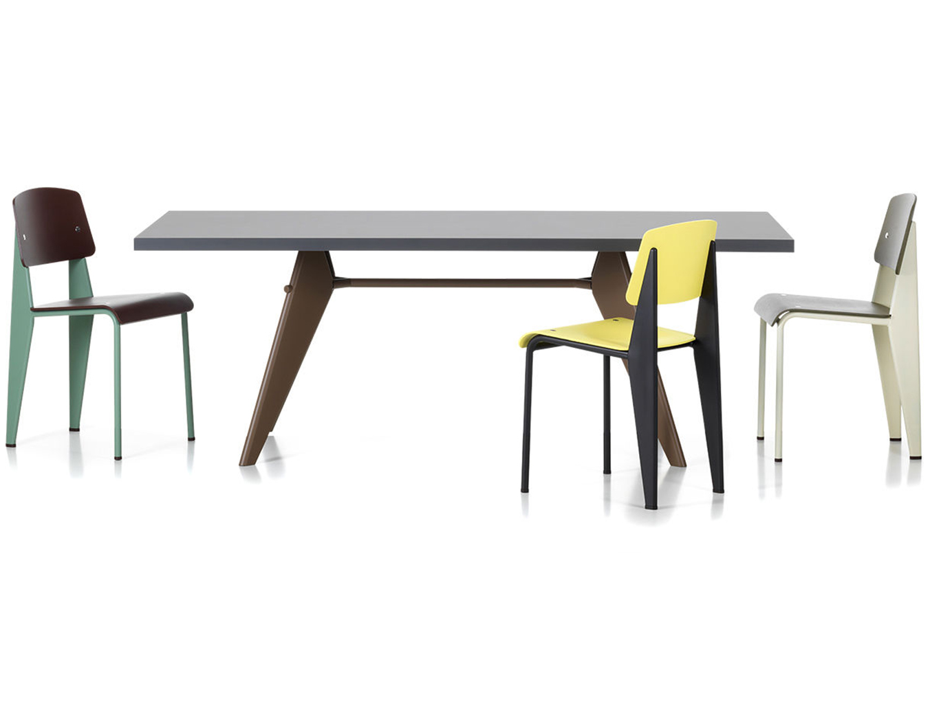 JeanProuvé的EM Table的美学外观坚持结构原则,说明其结构中的力和应力流动。 它有各种尺寸,桌面采用优质实木或HPL层压板,颜色可供选择。 长度为2000或2400毫米的顶部也有橡木贴面。 由于这种广泛的选择,每个餐厅都可以找到理想的EM Table。
