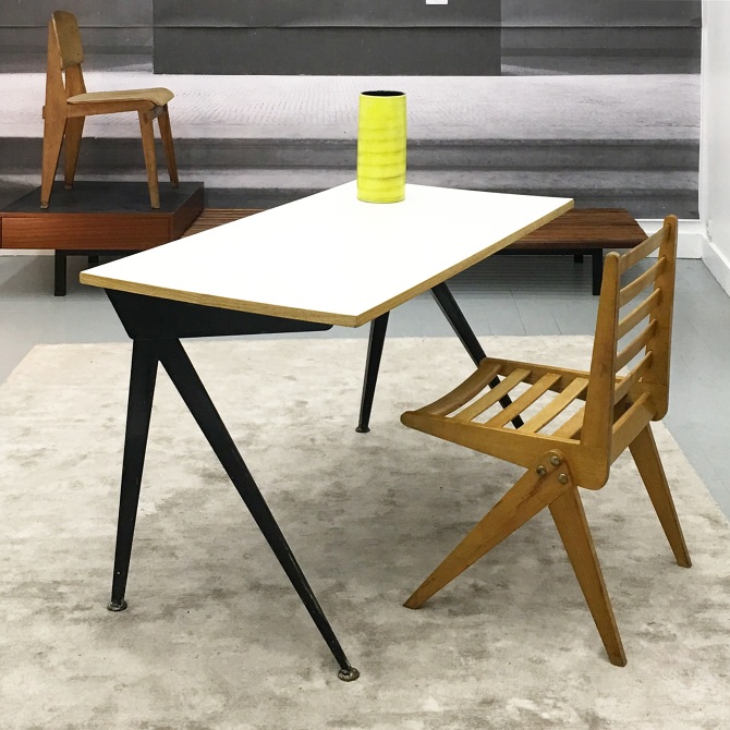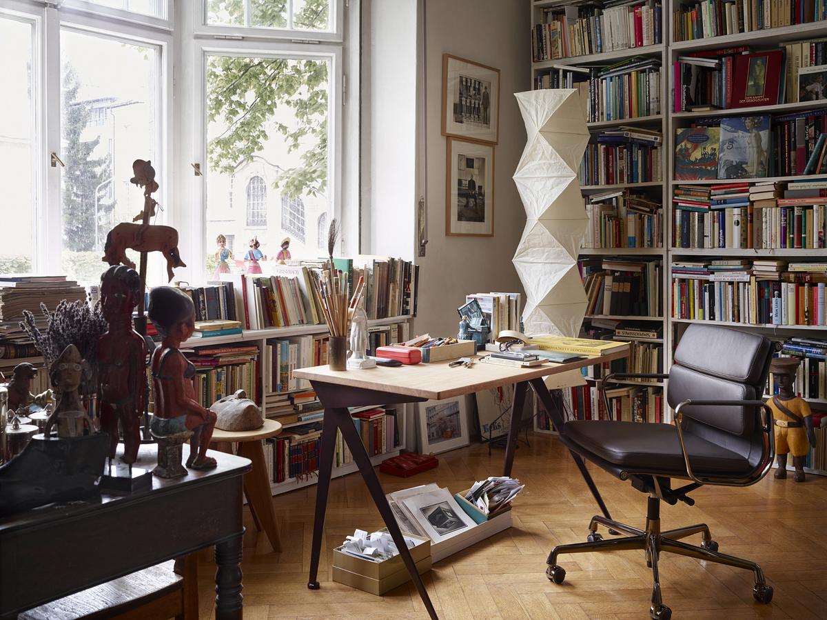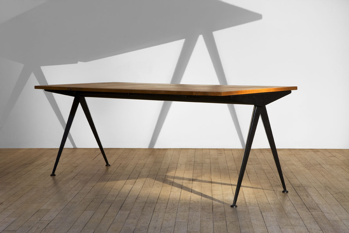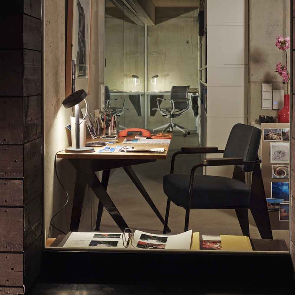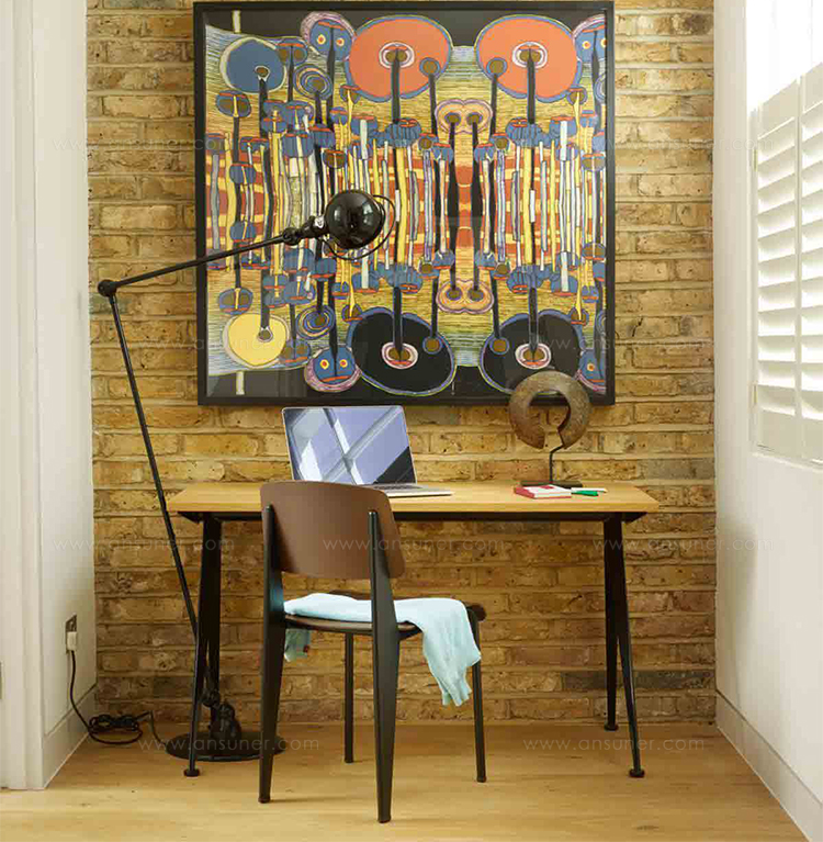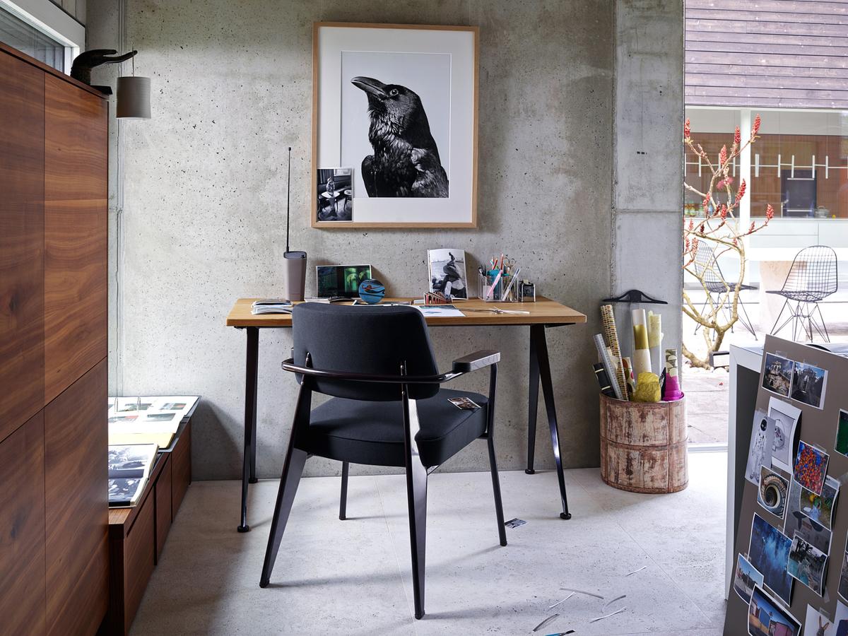 由JeanProuvé设计的Compas Direction办公桌,优雅的金属腿让人想起指南针的铰链臂 - 法语中的“le compas”。 他们的设计基于工程原理,代表了法国设计师和工程师的结构方法。 与涂油的实木桌面搭配,它们在家庭办公室形成了丰富的对比材料组合。