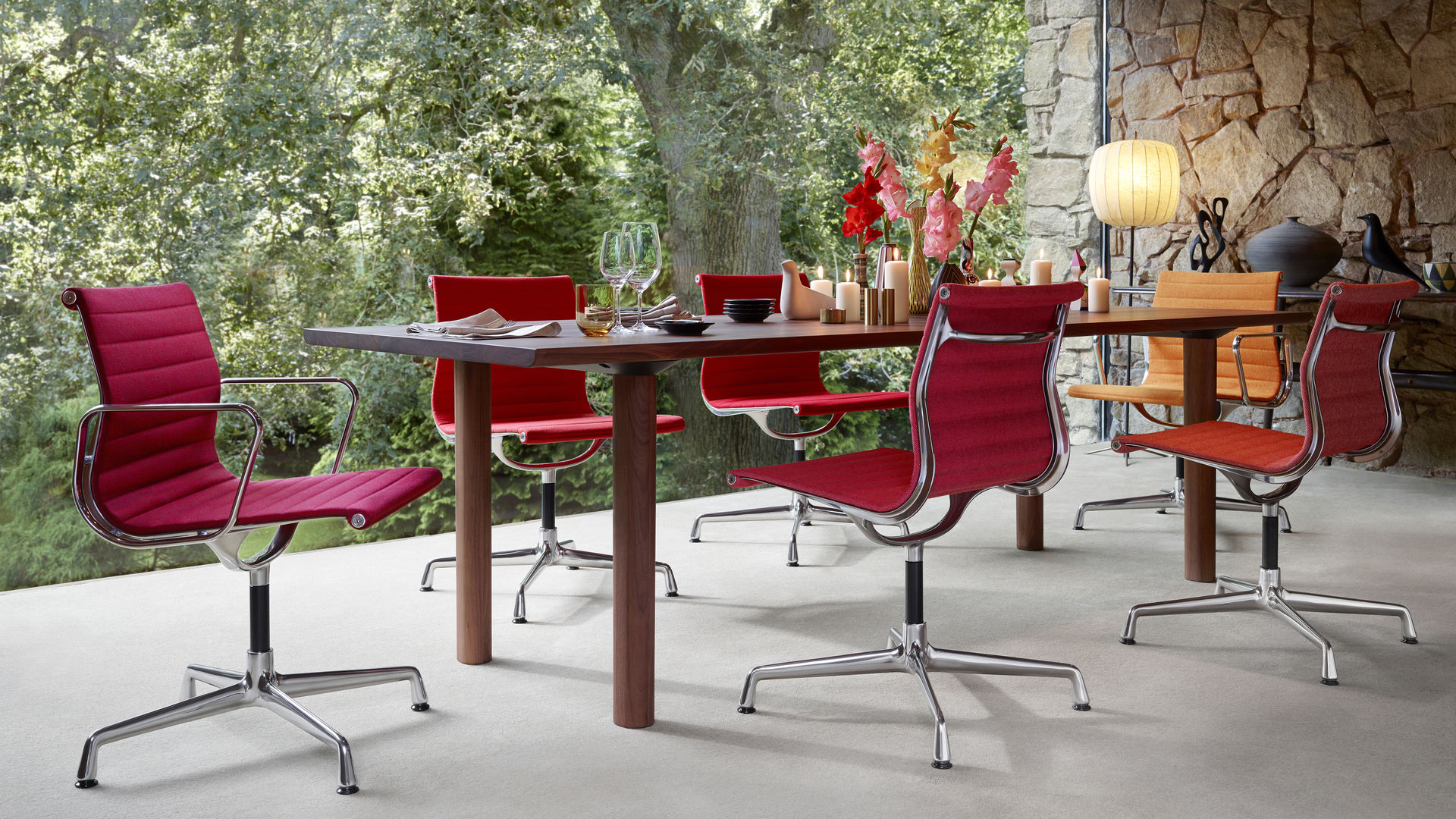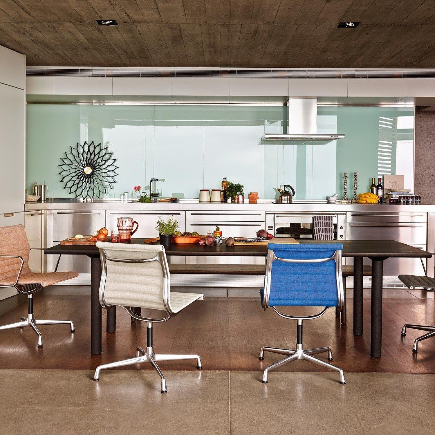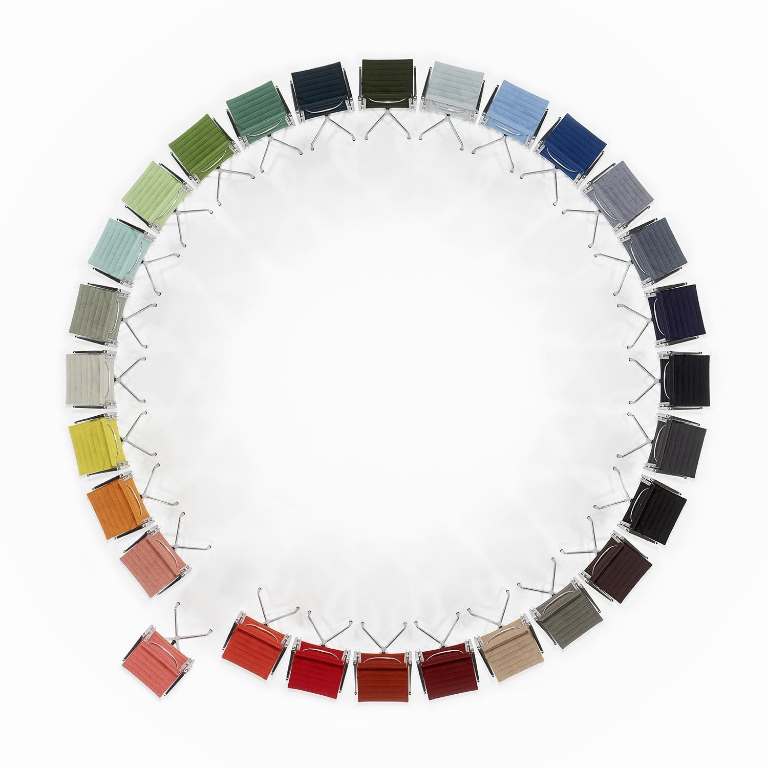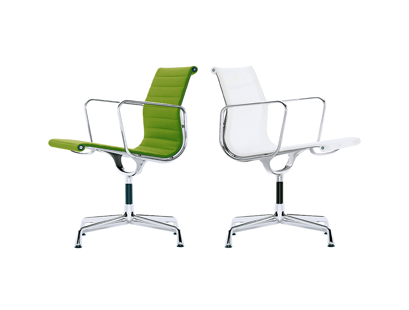 Charles和Ray Eames的铝椅EA 101,EA 103和EA 104非常适合与桌子组合使用:与铝组的其他型号相比,它们更轻,更高,更窄。 由于室内装潢具有多种柔和鲜艳的色彩,因此很容易找到适合任何餐厅的完美椅子。 这三种型号的不同之处在于基座的类型 - 固定或旋转 - 以及是否存在臂。