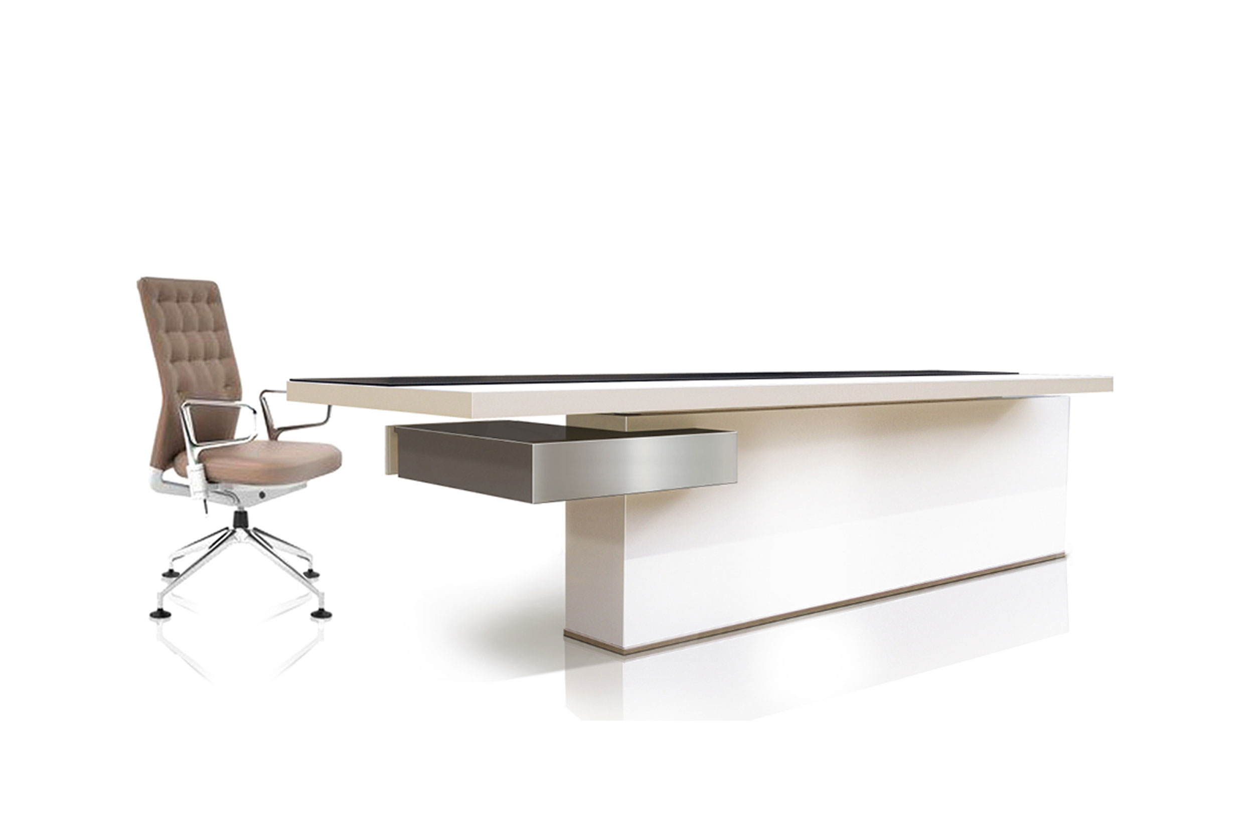 由于其金属核心结构,轻薄和加固的50毫米厚度桌面桌。工作桌面区域采用Techno Leather软垫。50mm结构前板在底部用不锈钢板完成。集成桌面电缆管理。(需要说明的是,桌面机翼在右侧或左侧,相对于工作桌面位置)