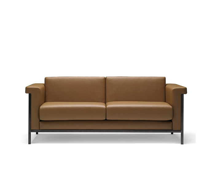 安装在黑色漆金属无框架上。一体式框架,无接头。低靠背与扶手齐平。可拆卸座椅和靠背垫。