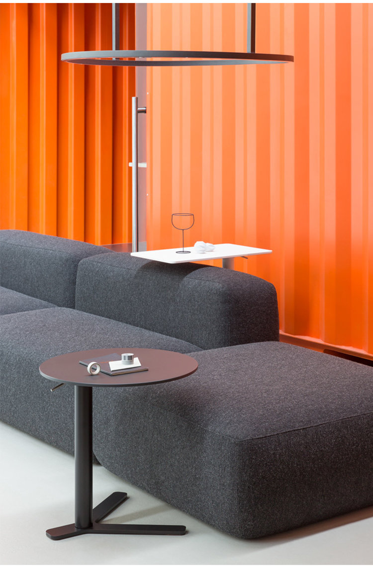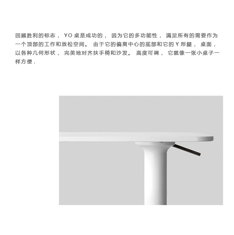回顾胜利的标志,YO桌是成功的,因为它的多功能性,满足所有的需要作为一个顶部的工作和放松空间。由于它的偏离中心的底部和它的Y形腿,桌面,以各种几何形状,完美地对齐扶手椅和沙发。高度可调,它就像一张小桌子一样方便.
