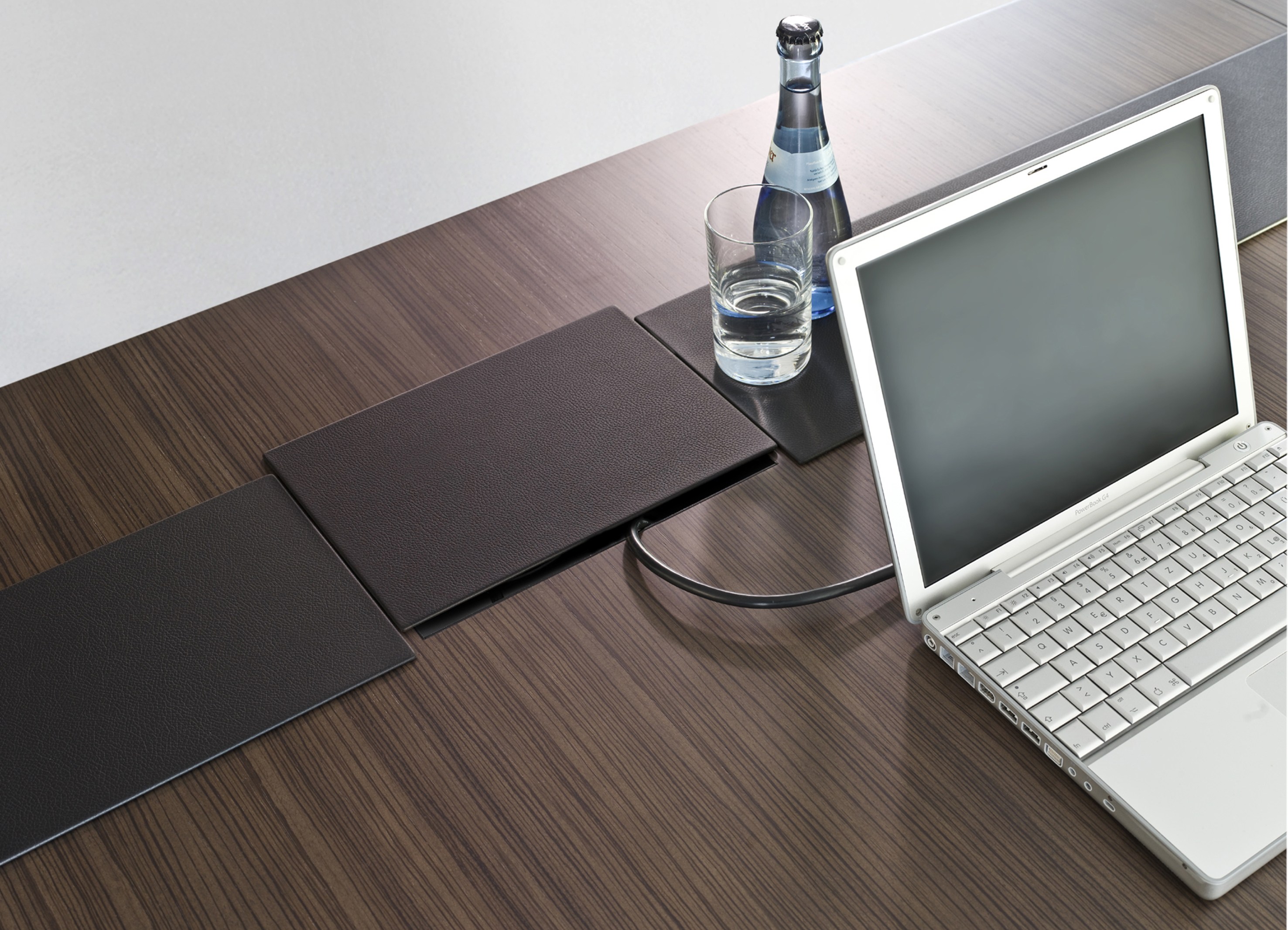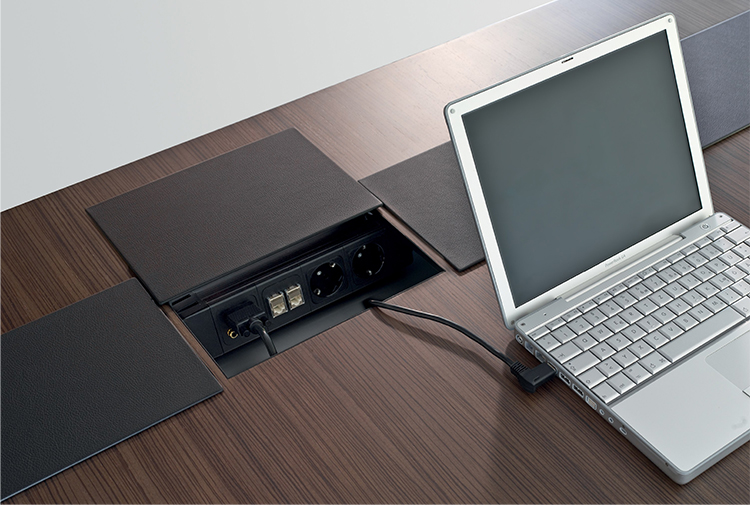 滑动皮革面板使通信技术巧妙地集成在桌面以下的空间