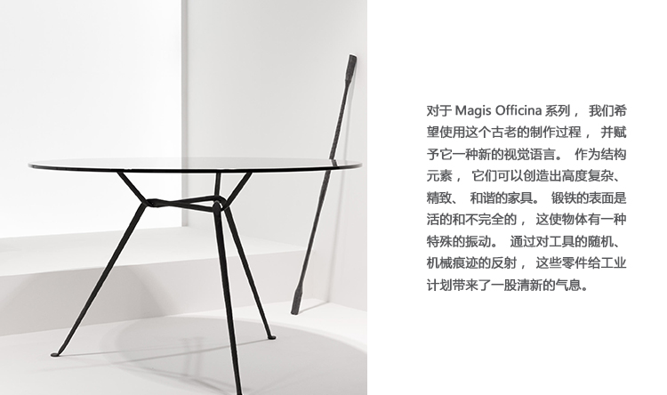 设计师罗南(Ronan)和Erwan Bouroullec用办公桌边设计了一种古老的锻造和锤击铁,用来制作各种形状。他们的目标是“利用这个古老的制造过程,给它一种新的视觉语言,”Erwan说。语言具有真实性和思想性。罗南指出:“通过对那些赋予它们形状的工具的随机、机械痕迹的反射,这些东西给工业计划带来了一股清新的气息。”