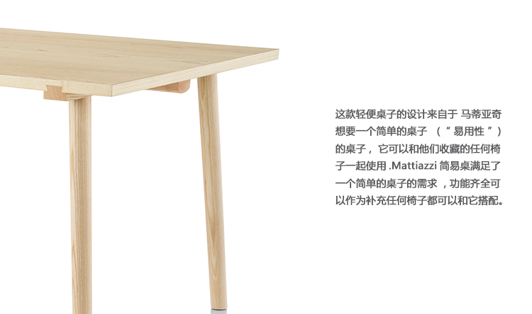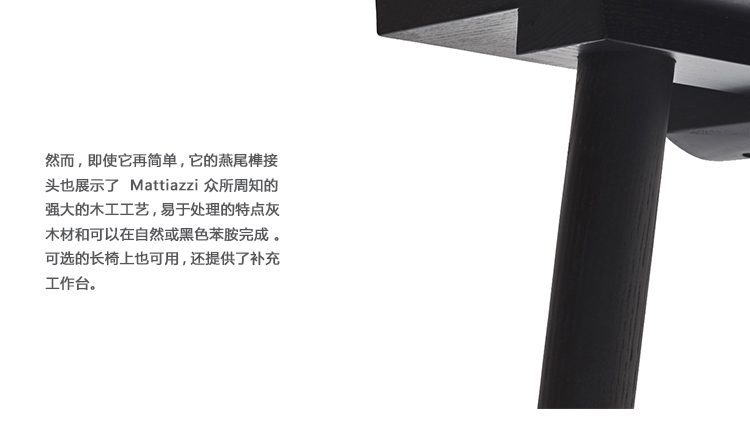 简易桌的设计是由于我们寻求在我们现在的Mattiazzi系列的12个产品系列之间架起一座桥梁的结果。我们正在寻找一张简单的(“简易”的)桌子,它可以和任何一个收藏品的椅子一起使用。这就是这个名字的来源,尽管我们可以用这个马蒂亚齐工艺的例子来命名它“Rondine”,或者更准确地说是“Coda di Rondine”。这种选择的灵感来源于它在我们矿区的家具中的使用,在那里我们注意到了它平淡无奇的、简单的美。它已经在那里使用了几个世纪,通常是为了确保