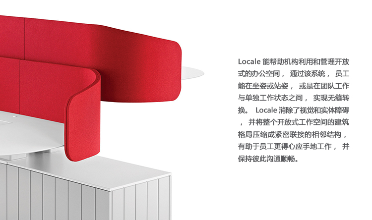 Locale能帮助机构利用和管理开放式的办公空间,通过该系统,员工能在坐姿或站姿,或是在团队工作与单独工作状态之间,实现无缝转换。Locale消除了视觉和实体障碍,并将整个开放式工作空间的建筑格局压缩成紧密联接的相邻结构,有助于员工更得心应手地工作,并保持彼此沟通顺畅。