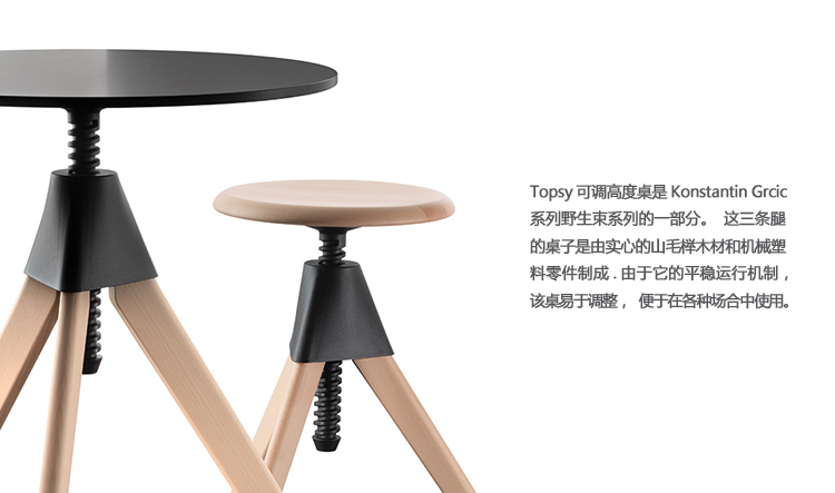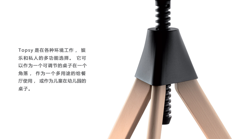 Topsy可调高度桌是Konstantin Grcic系列野生束系列的一部分。这三条腿的桌子是由实心的山毛榉木材和机械塑料零件制成.由于它的平稳运行机制,该桌易于调整,便于在各种场合中使用。Topsy是在各种环境工作,娱乐和私人的多功能选择。它可以作为一个可调节的桌子在一个角落,作为一个多用途的给餐厅使用,或作为儿童在幼儿园的桌子。