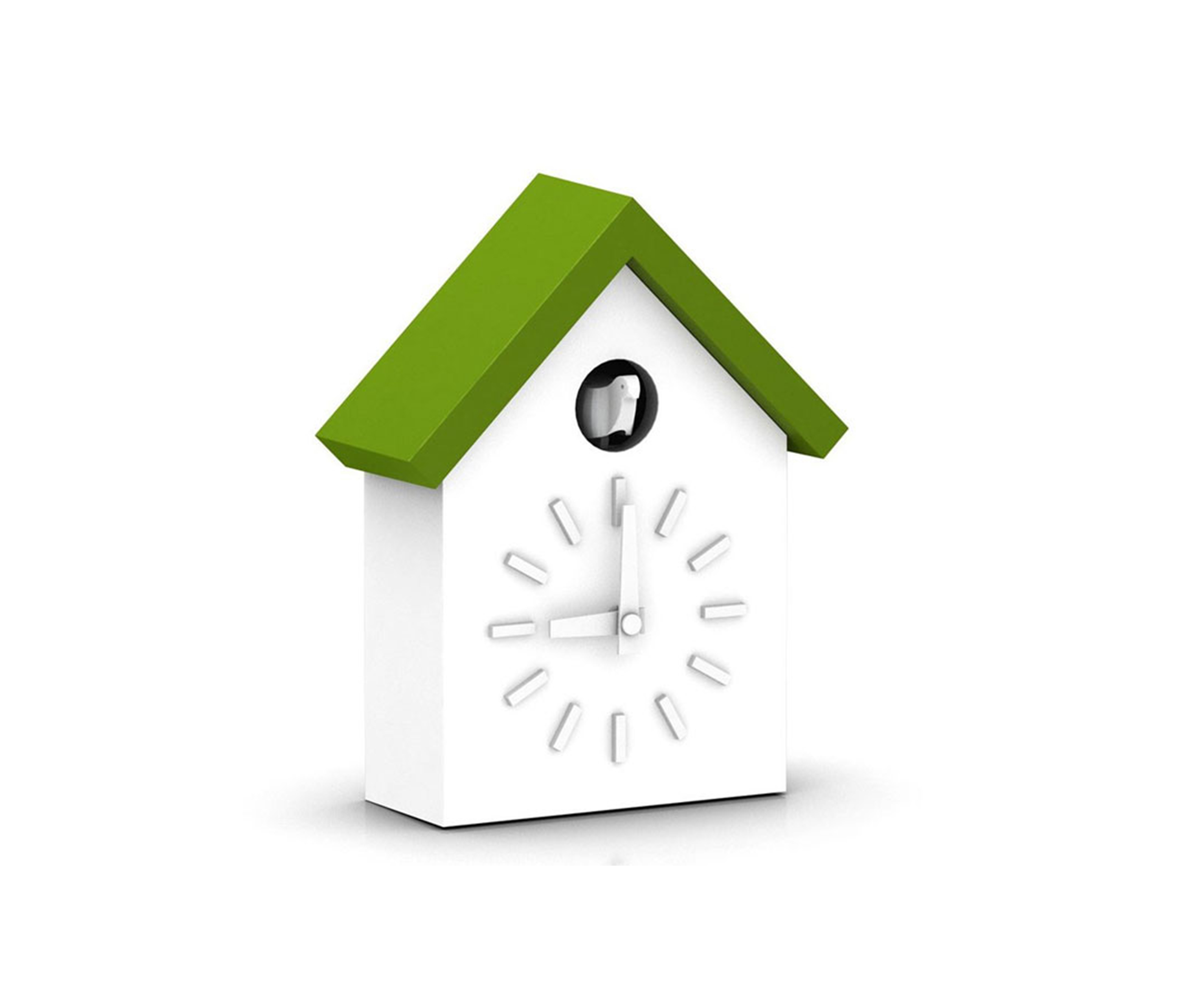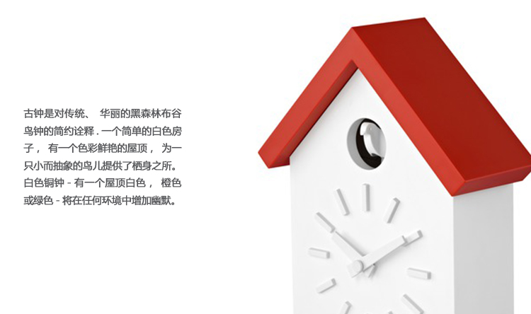 日本设计师福川忠雄(NaotoFuasawa)为马吉斯(Magis)提供了一种对传统的当代转折。巧妙地剥去装饰,木制齿轮,吊坠和链条,这决定了传统的黑森林布谷鸟钟的外观,福川在它的位置留下干净的线条,标准注射成型的ABS和电池动力。古钟是对传统、华丽的黑森林布谷鸟钟的简约诠释.一个简单的白色房子,有一个色彩鲜艳的屋顶,为一只小而抽象的鸟儿提供了栖身之所。白色铜钟-有一个屋顶白色,橙色或绿色-将在任何环境中增加幽默。