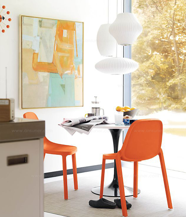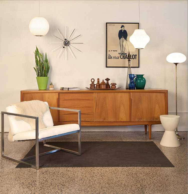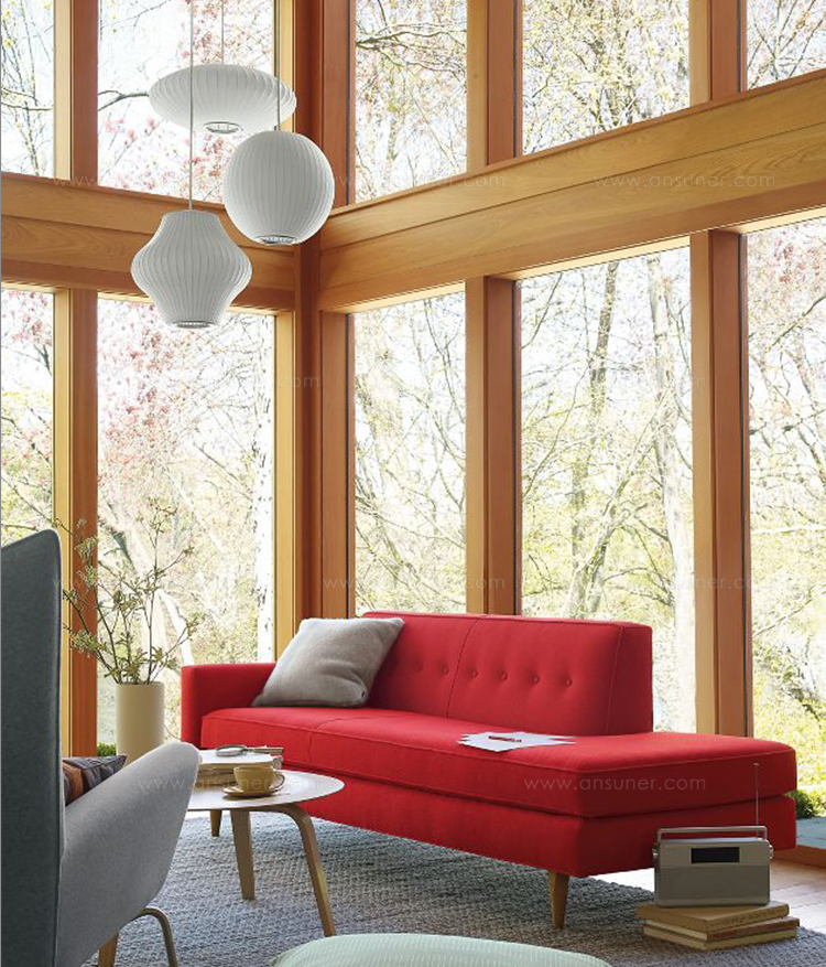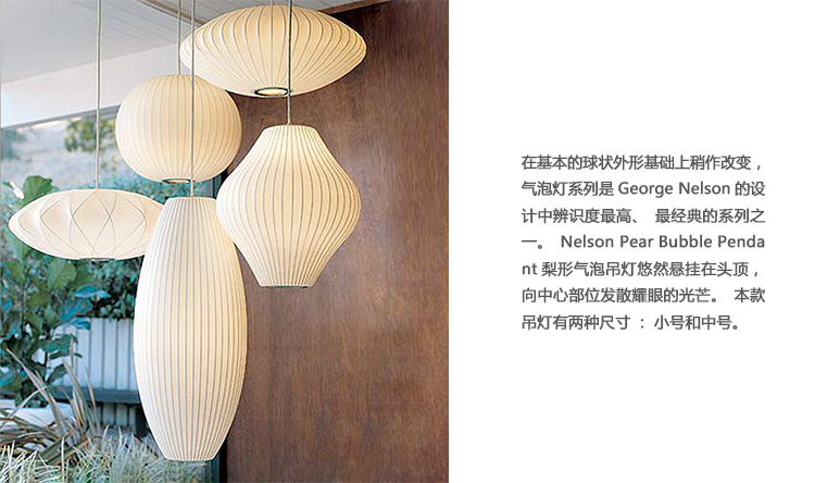 在基本的球状外形基础上稍作改变,气泡灯系列是George Nelson的设计中辨识度最高、最经典的系列之一。Nelson Pear Bubble Pendant梨形气泡吊灯悠然悬挂在头顶,向中心部位发散耀眼的光芒。本款吊灯有两种尺寸:小号和中号。1952年,美国市场引进了一款瑞典吊灯系列产品,George Nelson对此十分心仪,想要给自己的办公室买一套。那盏灯的价格在当时来讲实在过于高昂,让人望而却步,但却让他萌生出自行设计的念头来。其结果是一系列灯具的面世,这些灯具以一些自然的球状外形为特色,比如圆圆的苹果、加长的雪茄和造型优美的梨等。