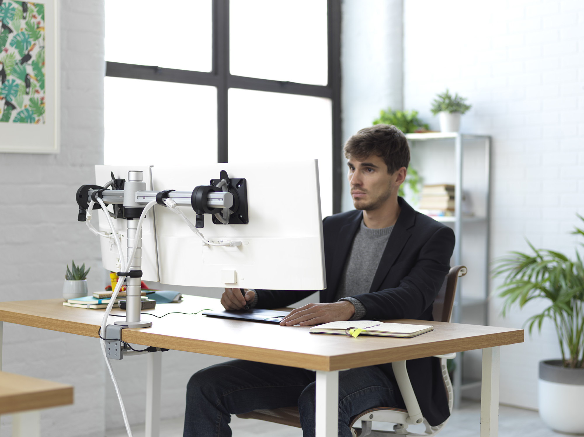 Wishbone系列的精致设计释放了工作台面上的空间,同时允许您将屏幕定位在适当的距离,以缓解颈部和眼睛疲劳。