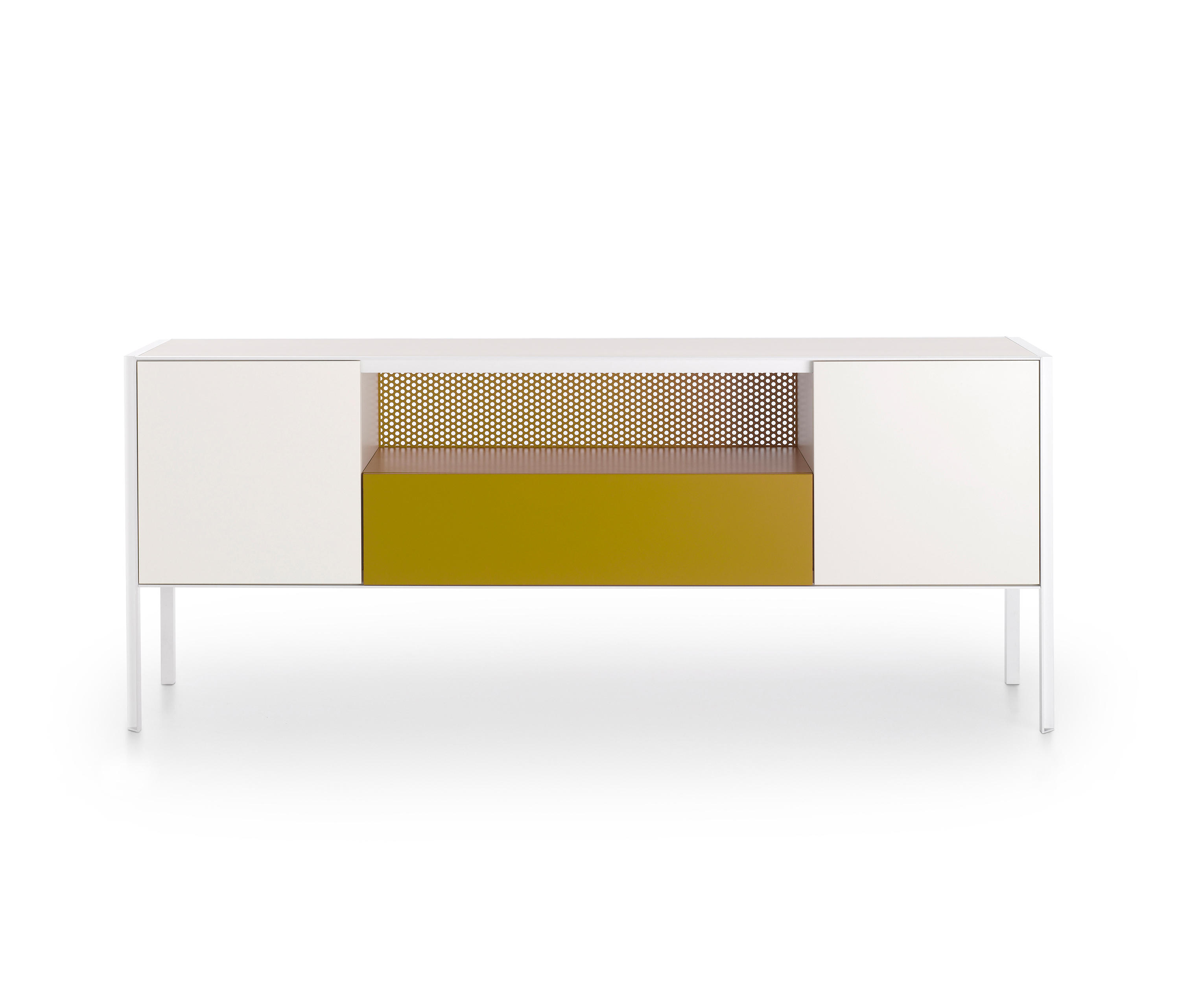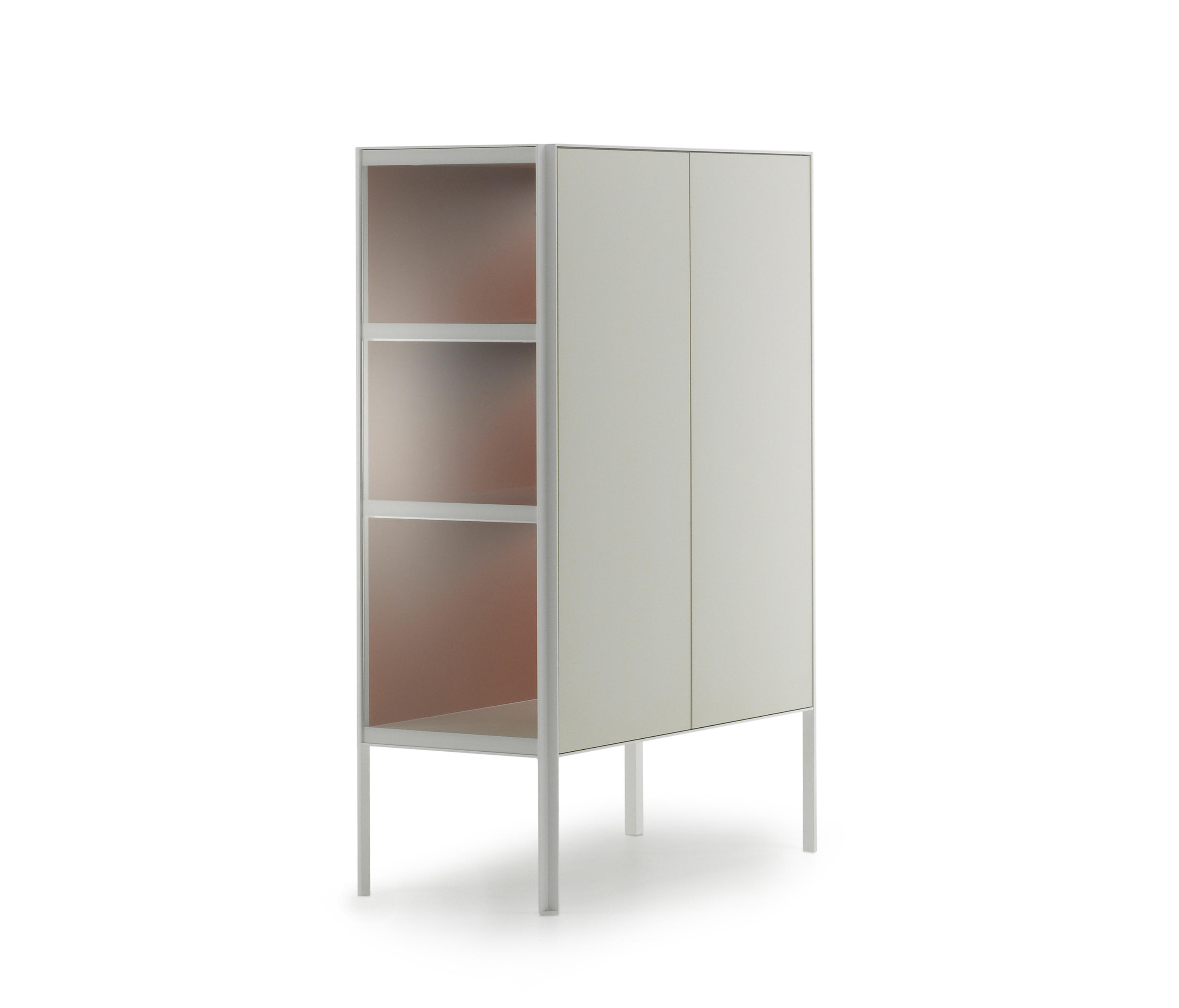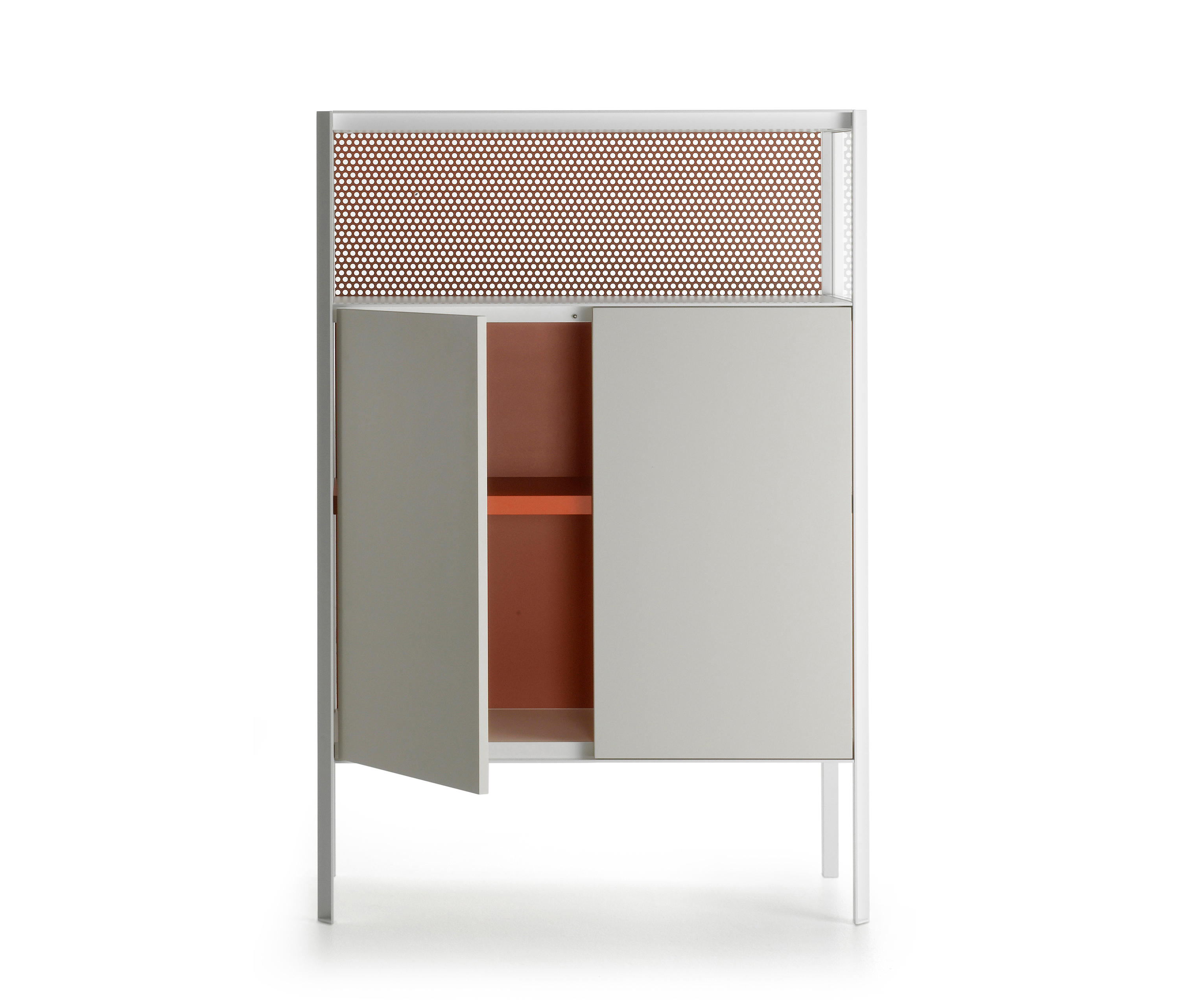 带有门,抽屉和开放式隔间的储物单元系统,适用于不同的家庭,办公室和公共环境。根据尺寸组合和正面设备,由不同储物单元组成的集合: -低L200 D50 H80厘米。可提供4门或2门,一个抽屉和一个开放式隔间,或两个门和一个双抽屉; -中号L151 D50 H116厘米。提供3门或3门和一个开放式隔层。 -高L103 D50 H152厘米。提供2门或2门和一个开放式隔层。 开放式隔间始终配备有带孔的靠背。 每个存储单元均可通过在两个侧面板的选项之间进行选择来定制: -透明的超透明玻璃,厚度为5mm -封闭,面板与结构的漆面相同。