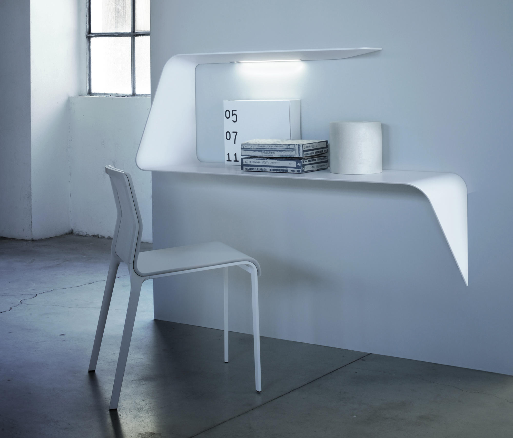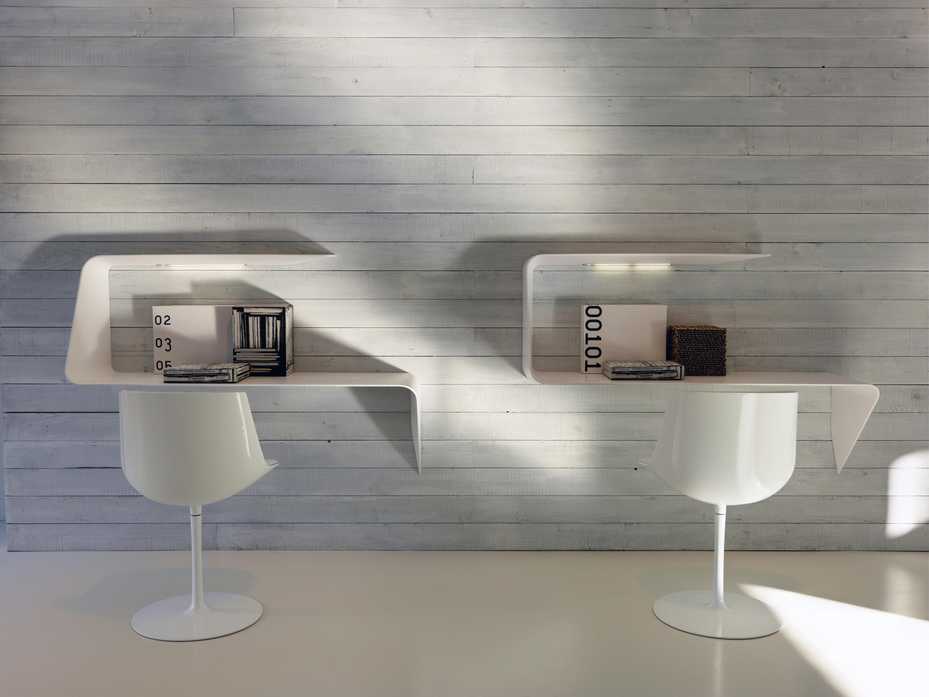 架子和/或壁挂式书桌。波浪形和渐缩的厚度为产品的设计和图像增添了强烈的视觉冲击。Mamba还配备了白色的HD LED。