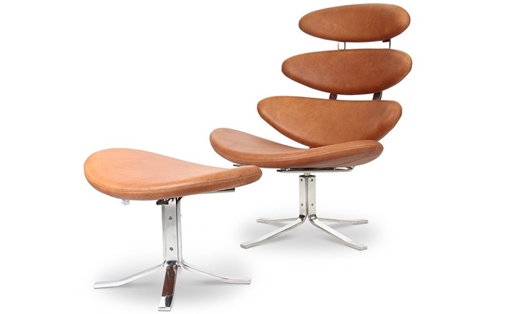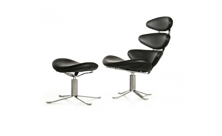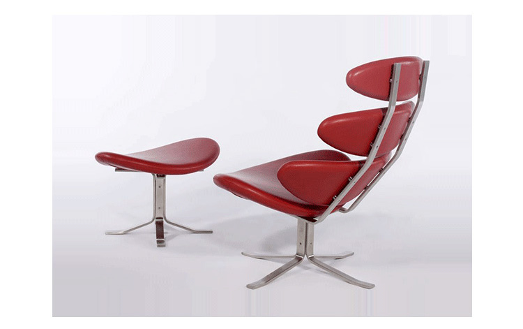 Poul M. Volther 于1964年的设计的王冠躺椅家具系列,是Poul M. Volther最知名的现代家具设计作品,此系列包括Corona Lounger Chair(王冠躺椅)、Corona Lounger Ottoman (王冠休闲脚踏)及其组合Corona Lounger Chair and Ottoman(王冠躺椅&脚踏)。历经40余年的今天,其作品在纷繁现代家具设计中仍占有一席之地。椅子充满了雕塑感,斯堪德维亚风格的简洁外形和舒适的坐感都是这张椅子成为创世之作的原因,四个椭圆形组成一张独特的椅子,无论摆放在哪,都令人过目不忘。此系列家具采用高强度钢材制作,表面电镀处理,外面为真皮或布艺制作,可360度旋转,不可后仰。适用范围广,酒店、会所、高档餐厅、夜总会、别墅等。