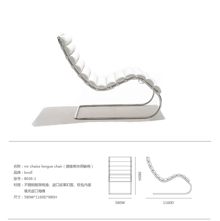 密斯躺椅(MR Adjustable Chaise Lounge)是由密斯·凡·德罗设计的,并由雅帝生产制造,我们是专业生产各种欧洲现代经典家具的公司,所以非常注重设计、质量和原版的一致性,所以我们成产出来的MR Adjustable Chaise Lounge外形独特,结构非常简单,弯曲的不锈钢架有点像布尔诺椅的设计思路,也正体现了德罗的“少即是多”的设计理念。休闲躺椅(MR Adjustable Chaise Lounge)以人体学为基础,设计出了符合人体架构的椅子,坐上去舒适,优雅大方。