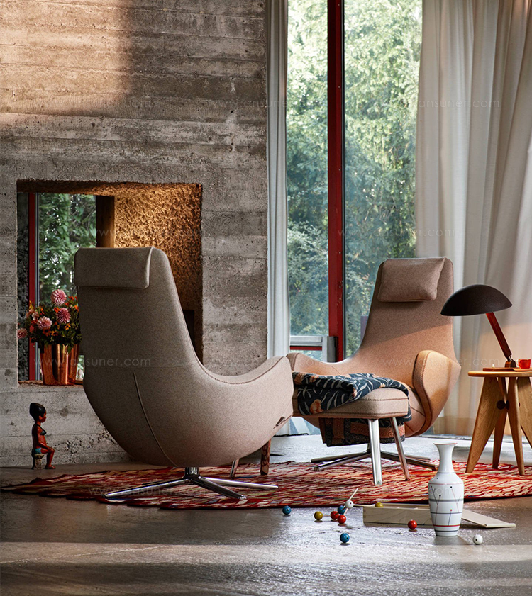 "repos lounge chair and ottoman(repos休闲椅&脚踏)由设计大师Antonio Citterio所设计。repos系列休闲椅采用钢制铝合金脚架、聚氨酯海绵填充、高级布艺扪面,可随意调整坐姿和高度,也可以放平躺,配上舒适的羽毛衬垫,无论阅读或者休憩,都非常舒服,符合人体工学,高档舒适,是办公,会议的理想选择。意大利设计师和建筑师 Antonio Citterio赋予了这边椅子永恒的优雅气质与无与伦比的舒适,是当代设计的经典,无论用在办公、商业、家庭都是非常高贵大气的。