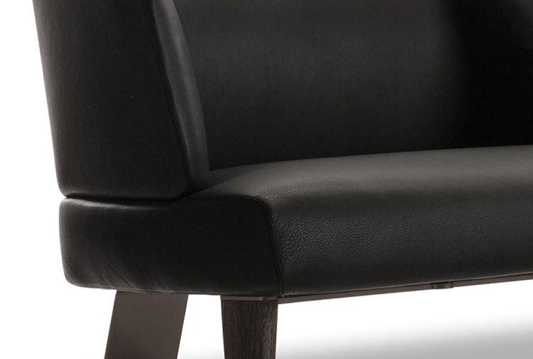 Creed “Lounge”沙发后方的地面支撑采用做工考究的弯曲金属架并搭配浅铜色亮光漆,前方支撑腿则为米灰色的鲍迪豆实木材质。支撑腿的上下方均采用精致的金属部件并搭配浅铜色亮面漆,用与众不同的细节设计来展现非同寻常的高超工艺。