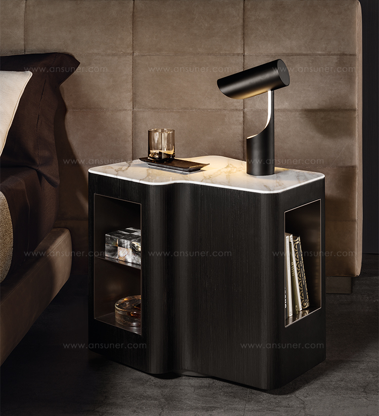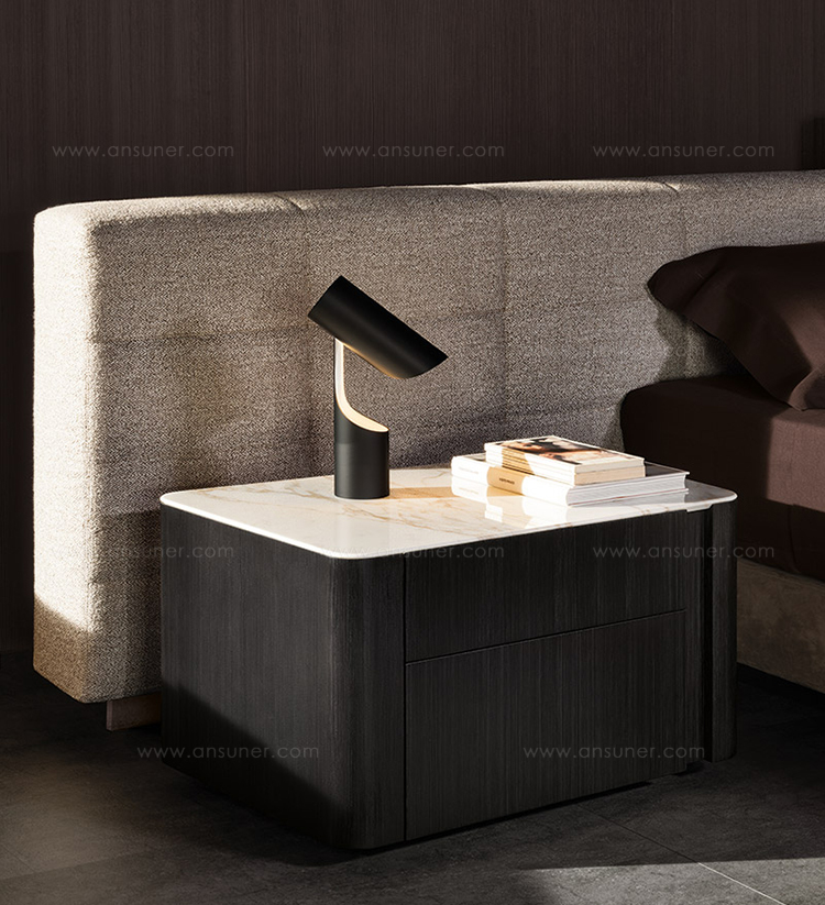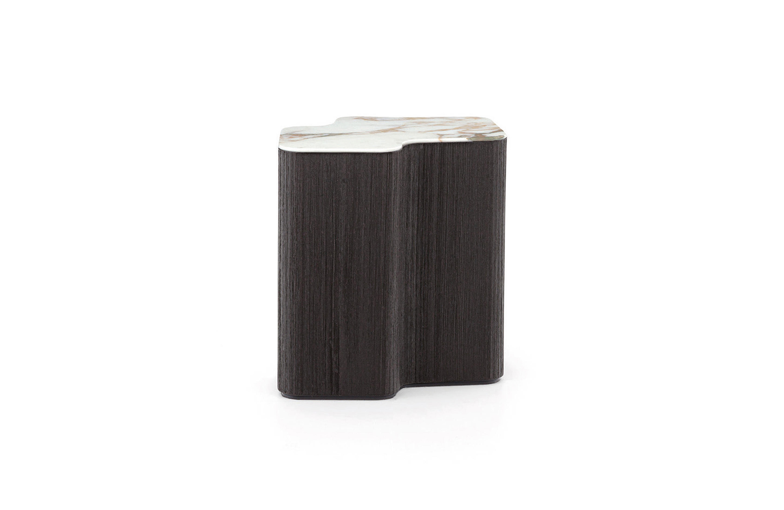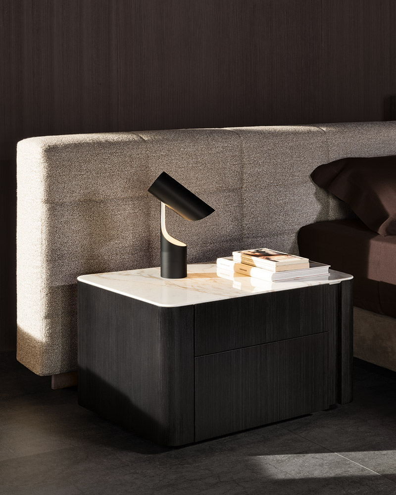 浅灰色与亮光灰褐色的落叶松木基座搭配不同材质的嵌装台面,打造出与众不同的对比效果:Calacatta大理石的华贵气质与玻璃釉的纵深感,配合木材的温润质感。 不同寻常的造型和迷人的材质组合为这款卧室家具配件平添一份独特的魅力,Lou系列所特有的美学图样也呈现其中。