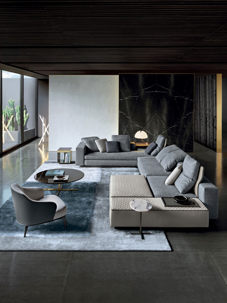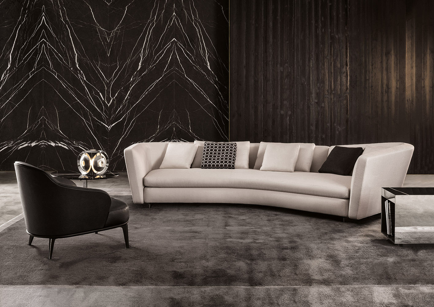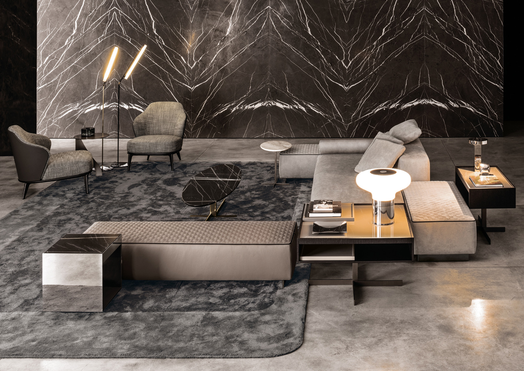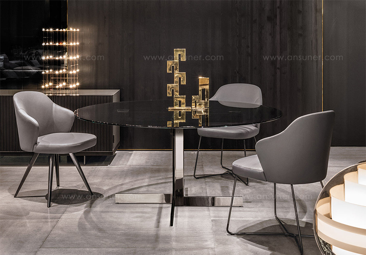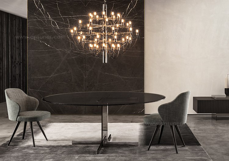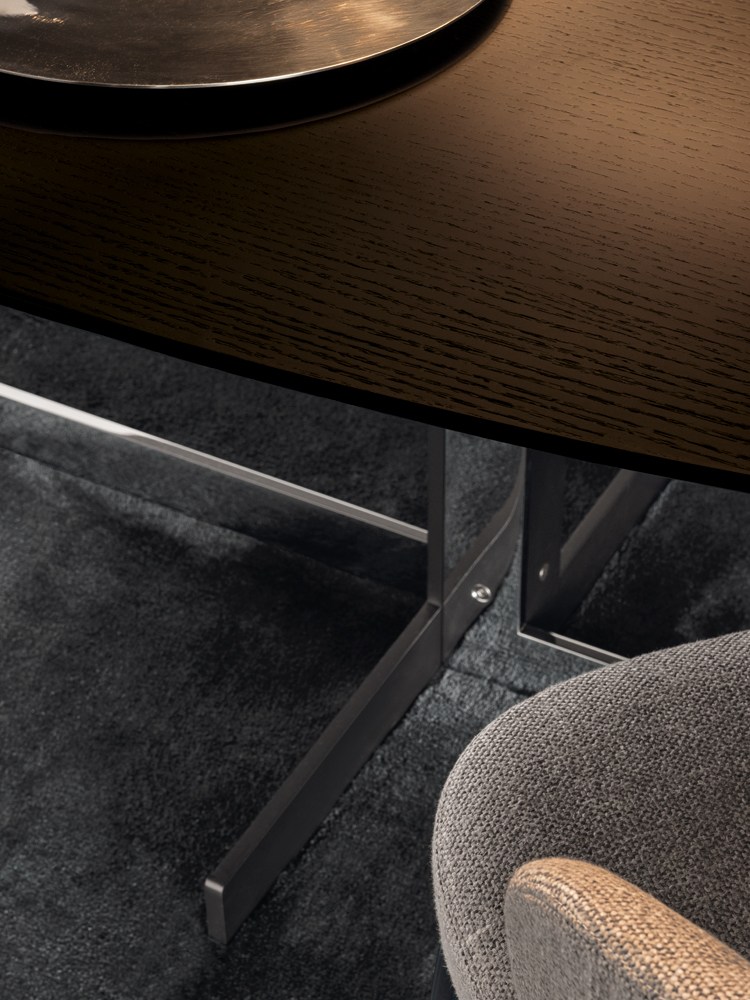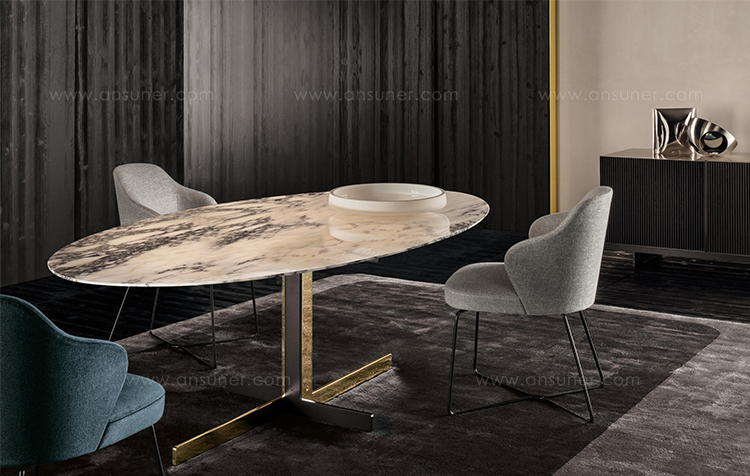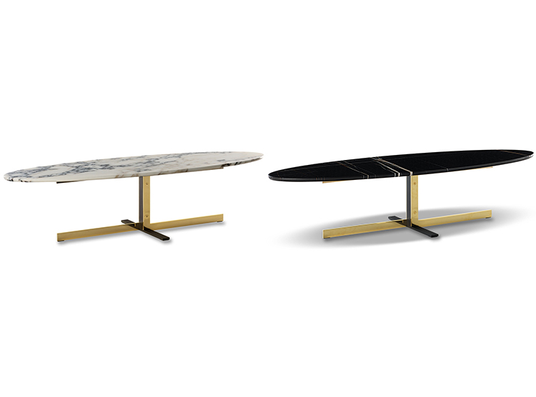 如果说Catlin边柜的设计崇尚简洁,那么材质的选择则旨在打造非凡的视觉和触觉效果。金属基座有着精致的十字形地面支撑腿,其中包括颇有趣味的组合:黑色压花搭配铬色或金色的抛光表面,打造出多种多样的风格。材料的搭配体现出非凡的优雅感,台面可以选择两种珍稀名贵的大理石,Arabescato Purple或Sahara Noir,两者都拥有抛光表面。