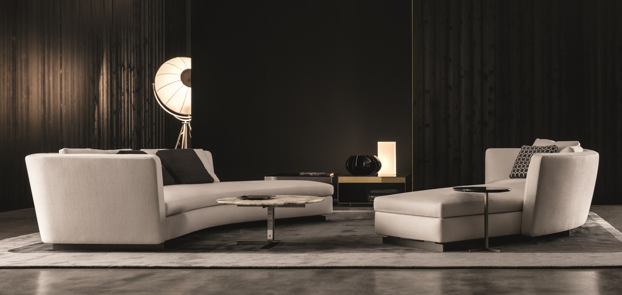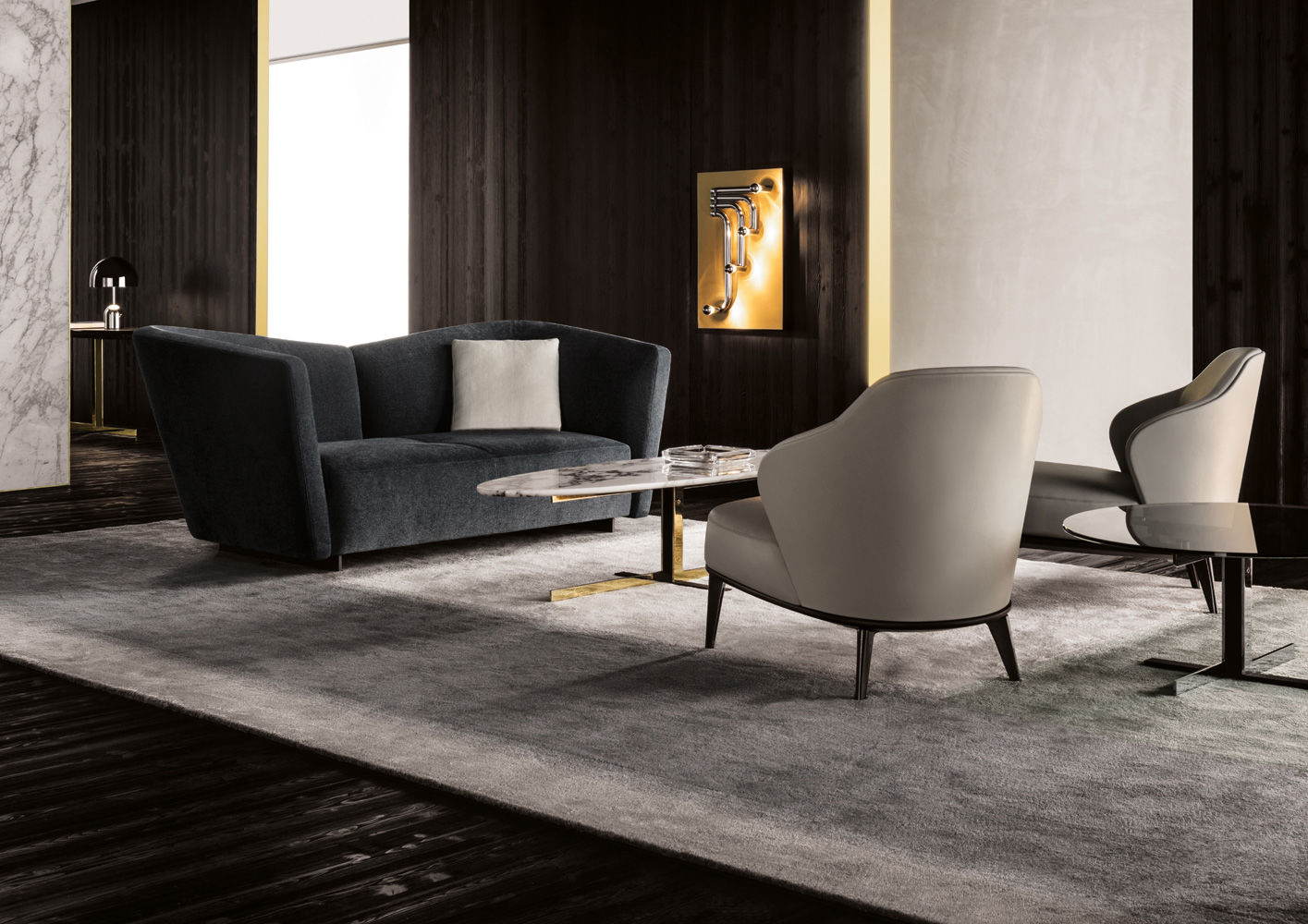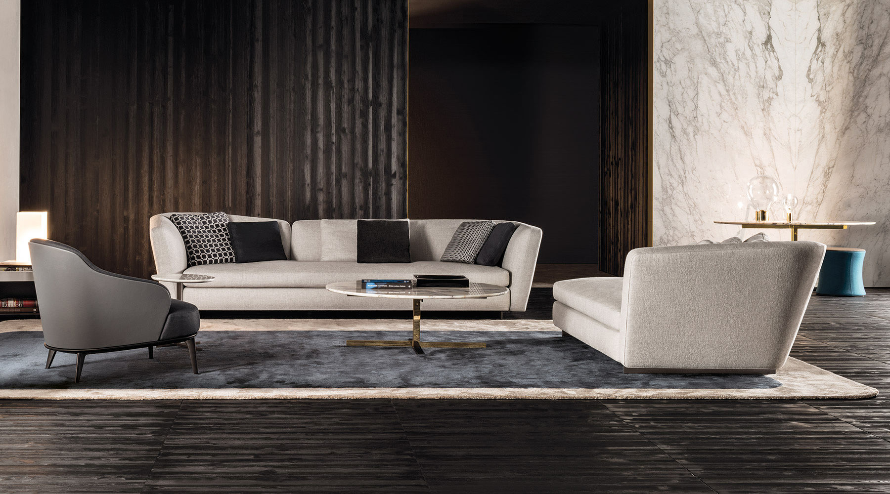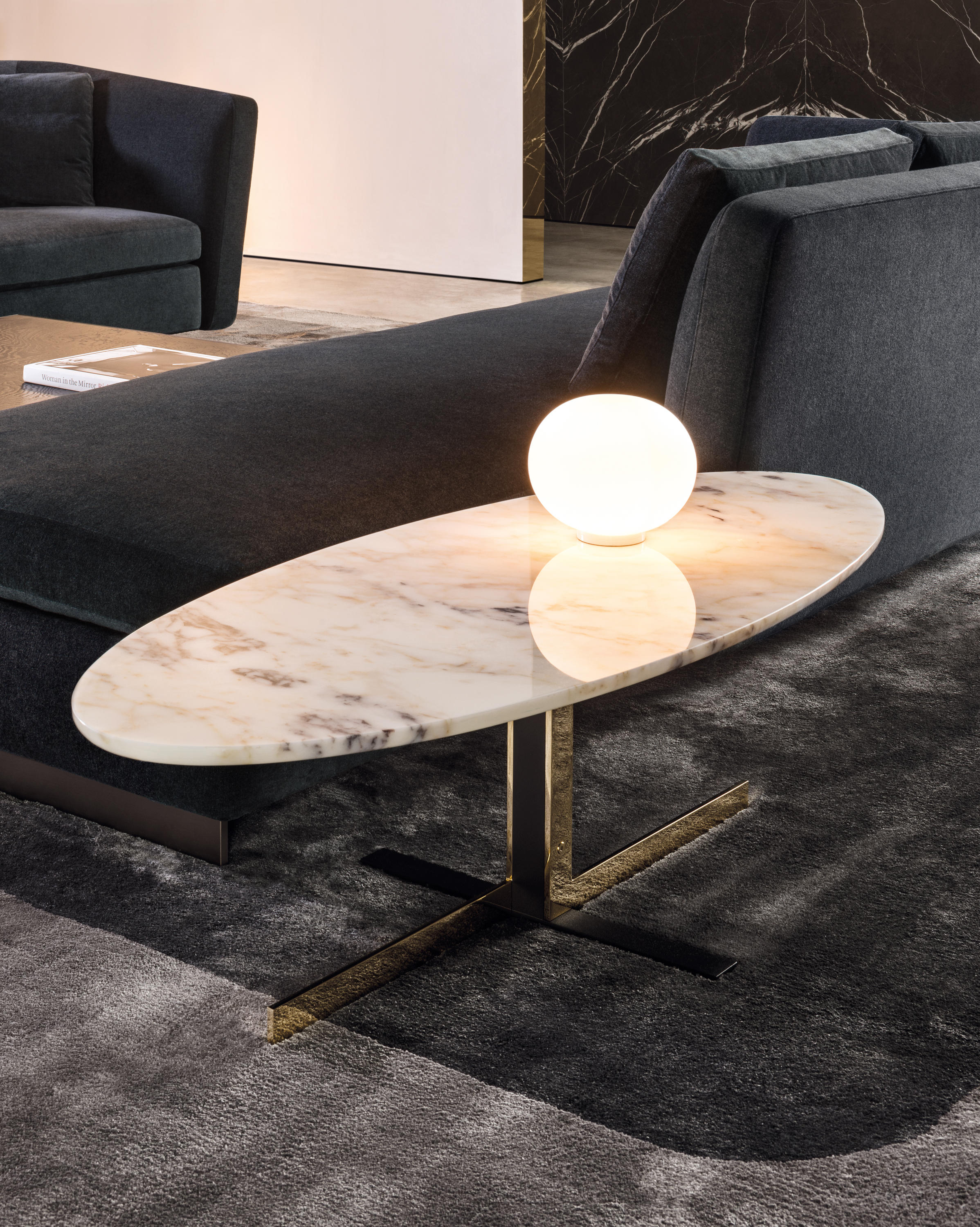 如果说Catlin边柜的设计崇尚简洁,那么材质的选择则旨在打造非凡的视觉和触觉效果。金属基座有着精致的十字形地面支撑腿,其中包括颇有趣味的组合:黑色压花搭配铬色或金色的抛光表面,打造出多种多样的风格。材料的搭配体现出非凡的优雅感,台面可以选择两种珍稀名贵的大理石,Arabescato Purple或Sahara Noir,两者都拥有抛光表面。
