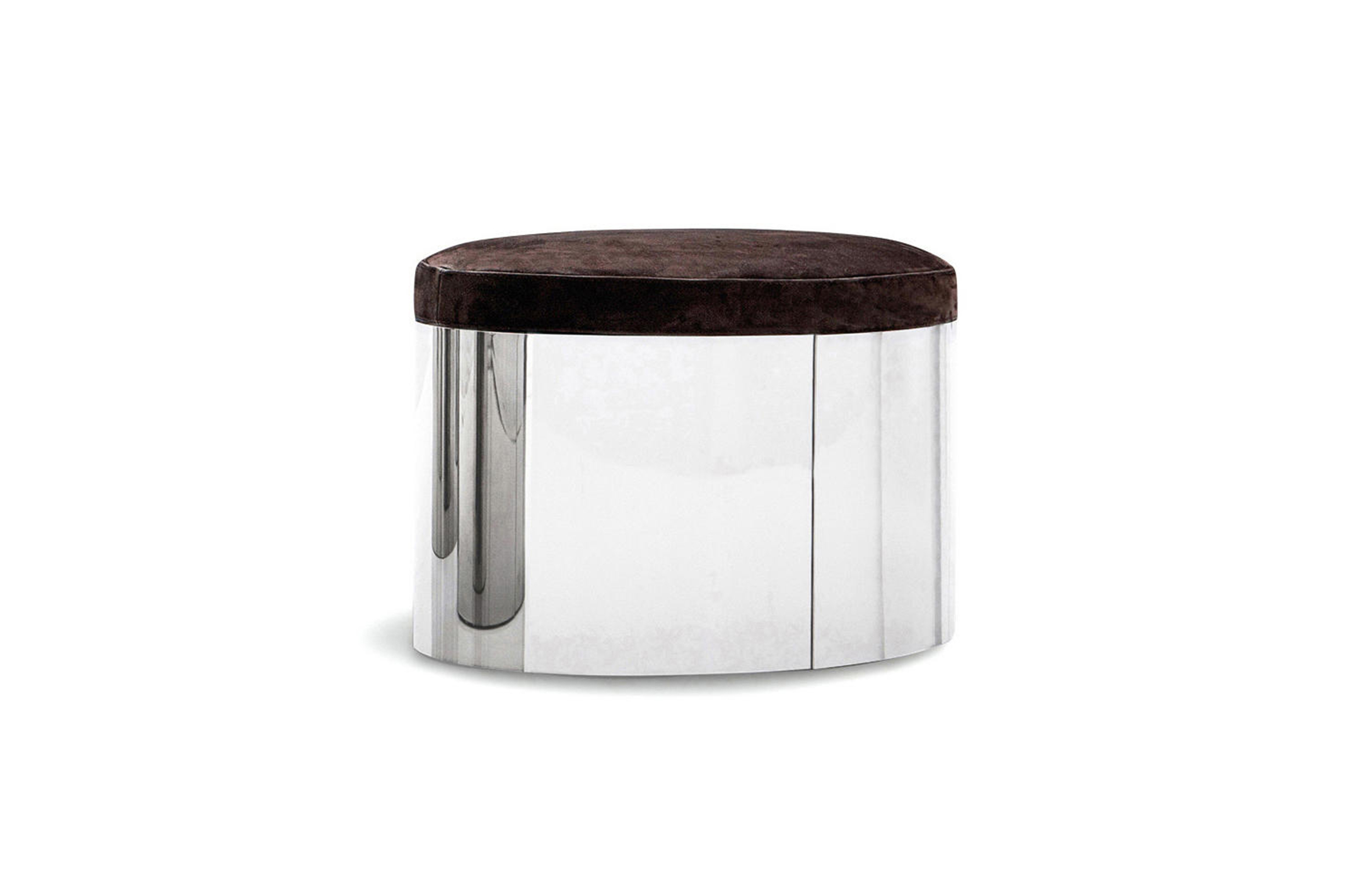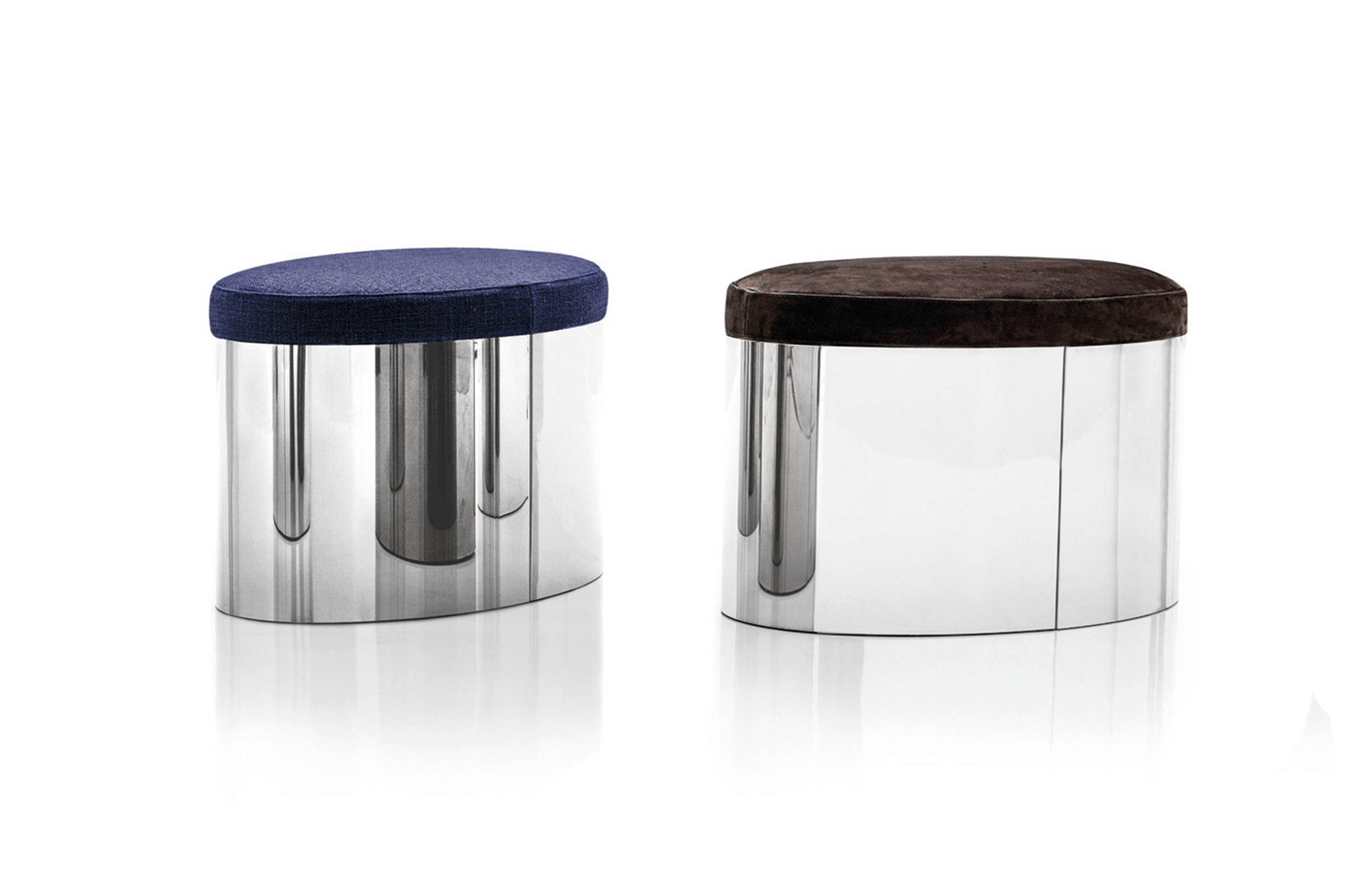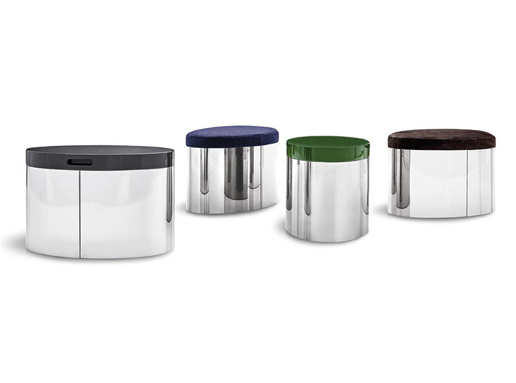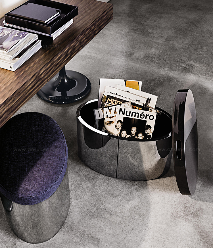 这款产品属于Raymond系列,但是又自成风格,可以作为边几也可以成为座椅,其内部还有一个极为实用的杂志收纳空间。收纳凳的底部为黑色皮革饰面,印有Minotti的logo。上方部件采用亮光漆面,颜色为白色、Sand色、花岗石色、绿色和紫色,搭配实用的椭圆形内嵌手柄,以此可轻松提起顶盖。休闲凳版本的上方部件则添加填充物,包覆Minotti独家系列中的布料和皮革。