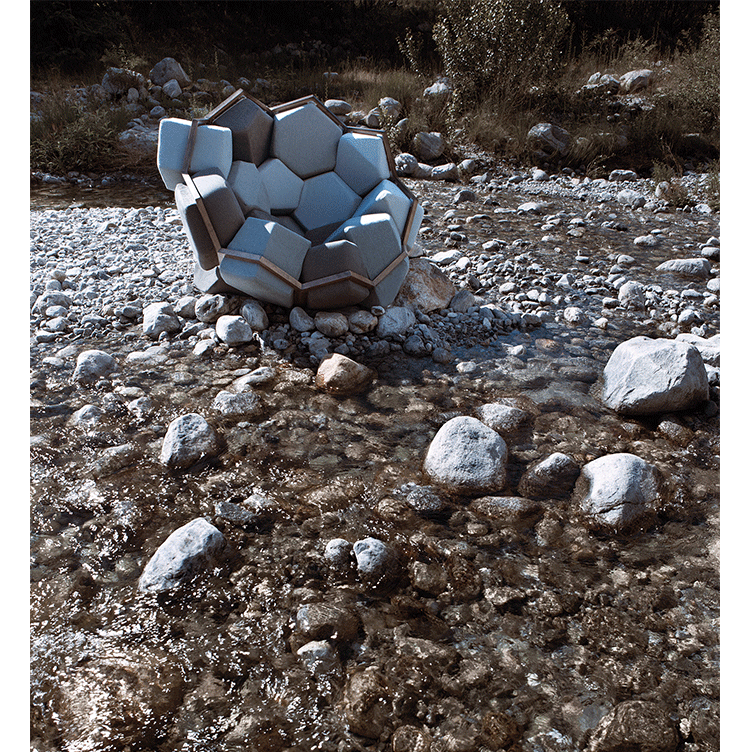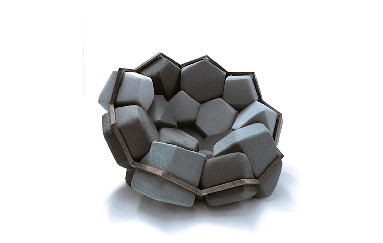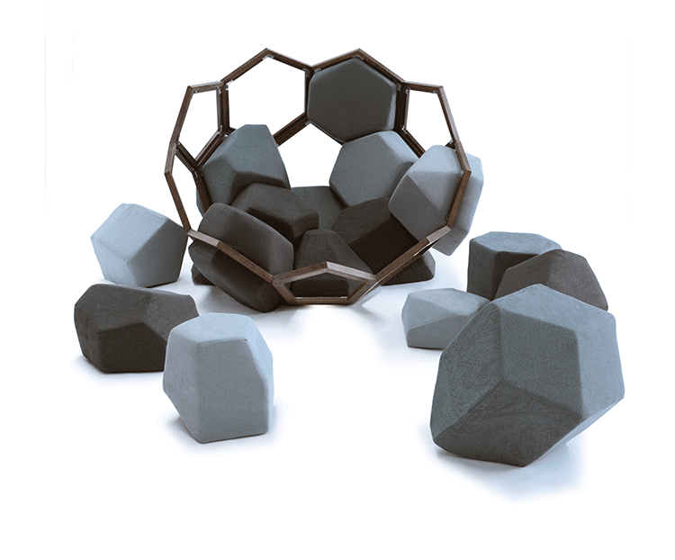 米兰的Ctrlzak设计工作室与Davide Barzaghi联手设计了一款几何风扶手椅Quartz(石英扶手椅)。很多创意的灵感都来自自然与几何结构的排列组合,Quartz就是其中典型的代表。它的整体结构由一个五边形和六边形的二位结构组成,就像钻石的结构那样,很自然的过度到一个三维结构。每一个五边形和六边形的组成部分都套上彩色环保面料做成的大小合宜的套子,所以这个几何风的扶手椅也别有一番野外的自然风情。该椅由十二面体的模块与带有六边形镂空图案的框架组成,而框架的整体结构则与天然结晶的形态相同。Quartz椅的各个软体模块表面由同一色系多种颜色的生态面料包覆,使其最终的外观看上去更像是自然界中的某种小生境,而非一把普通的座椅。比起座椅来,这款有趣的Quartz似乎更像是一件超大型的智力玩具——你必须把各个模块填放到合适的空格中去,在给你带来舒适的同时,也带来无尽趣味。