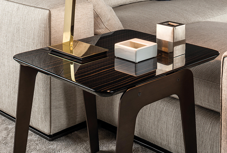 以精美梣木底座致敬传统黑檀木艺术,搭配拥有圆滑转角与柔和饰边的光泽漆面黑檀木、黑色脱蜡琉璃及 Marron Damasco 大理石台板。