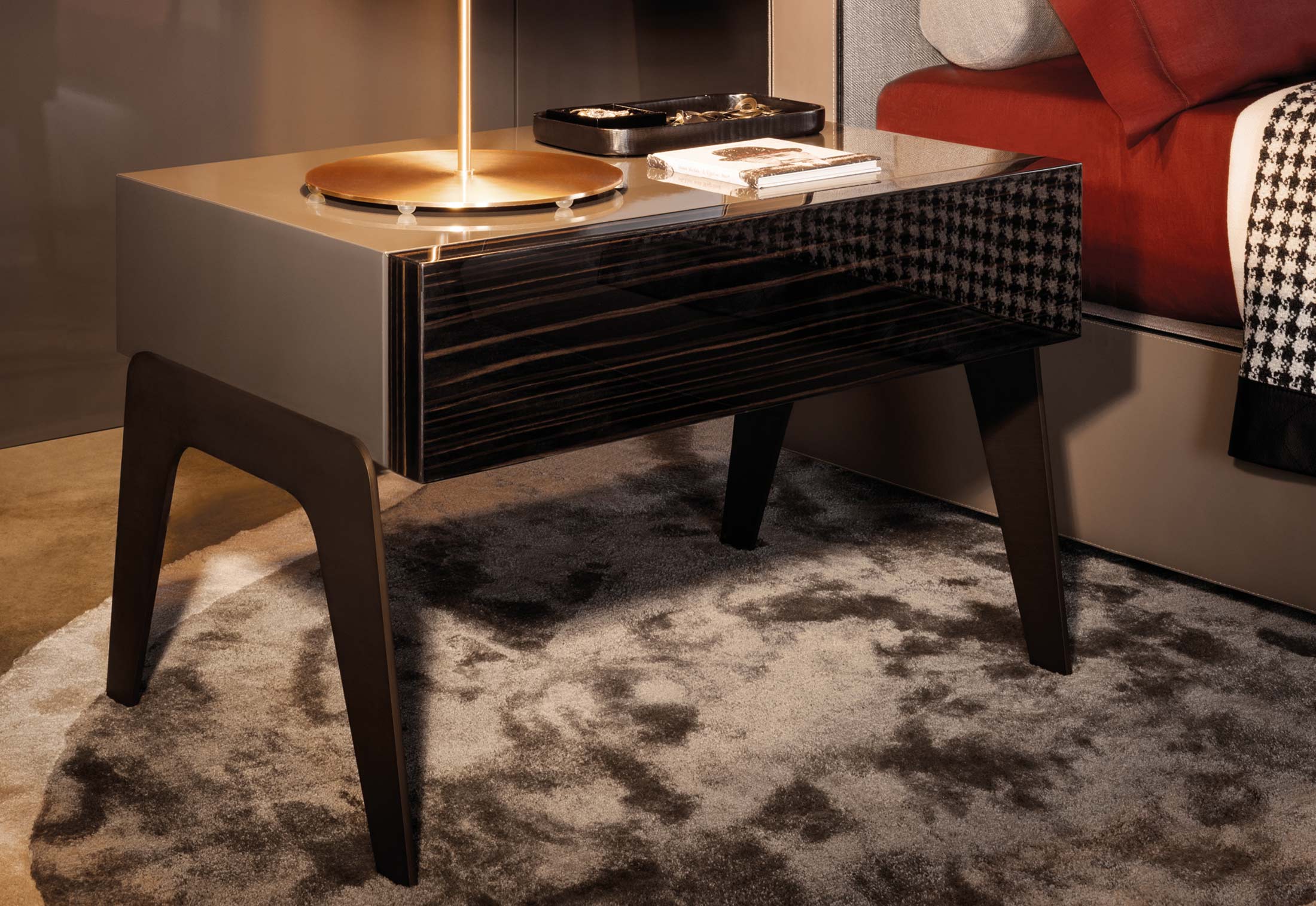 以精美梣木底座致敬传统黑檀木艺术,搭配拥有圆滑转角与柔和饰边的光泽漆面黑檀木、黑色脱蜡琉璃及 Marron Damasco 大理石台板。