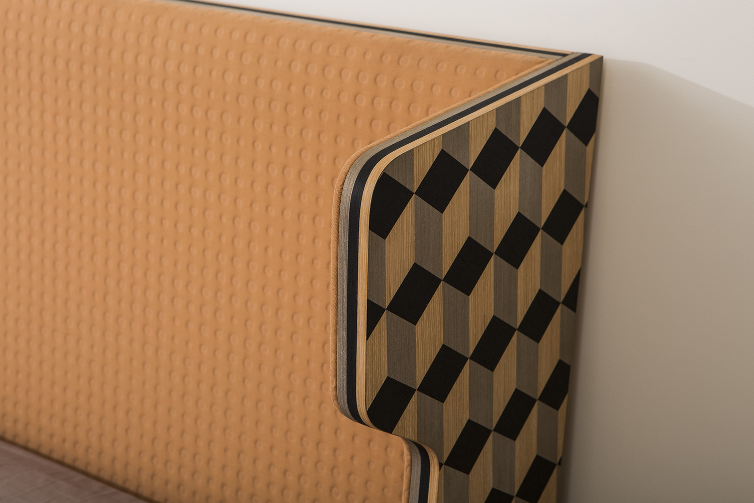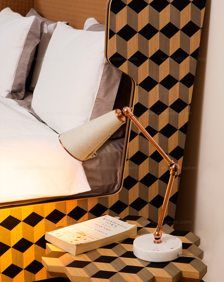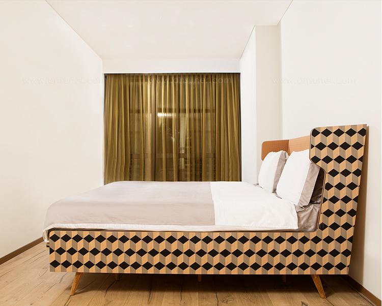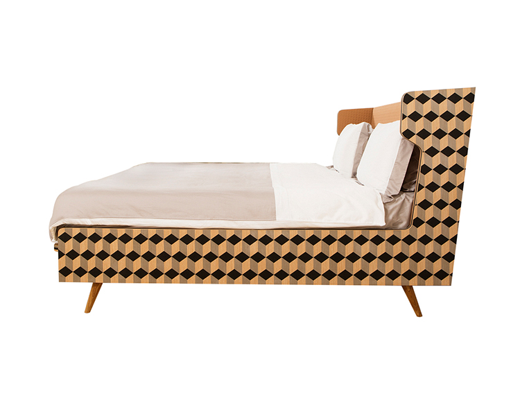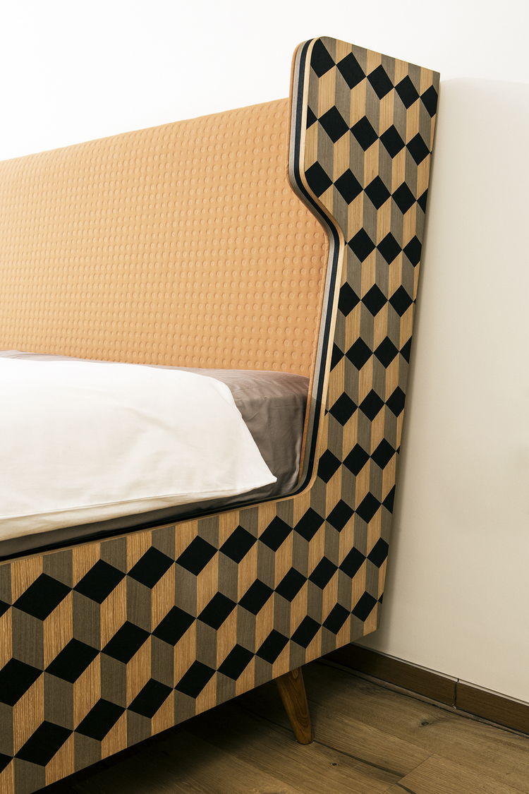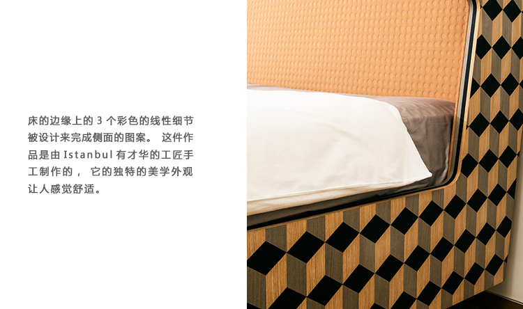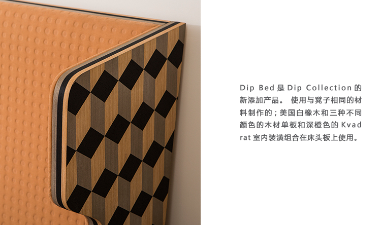 Dip Bed是Dip Collection的新添加产品。使用与凳子相同的材料制作的;美国白橡木和三种不同颜色的木材单板和深橙色的Kvadrat室内装潢组合在床头板上使用。床的边缘上的3个彩色的线性细节被设计来完成侧面的图案。这件作品是由伊斯坦布尔有才华的工匠手工制作的,它的独特的美学外观让人感觉舒适。