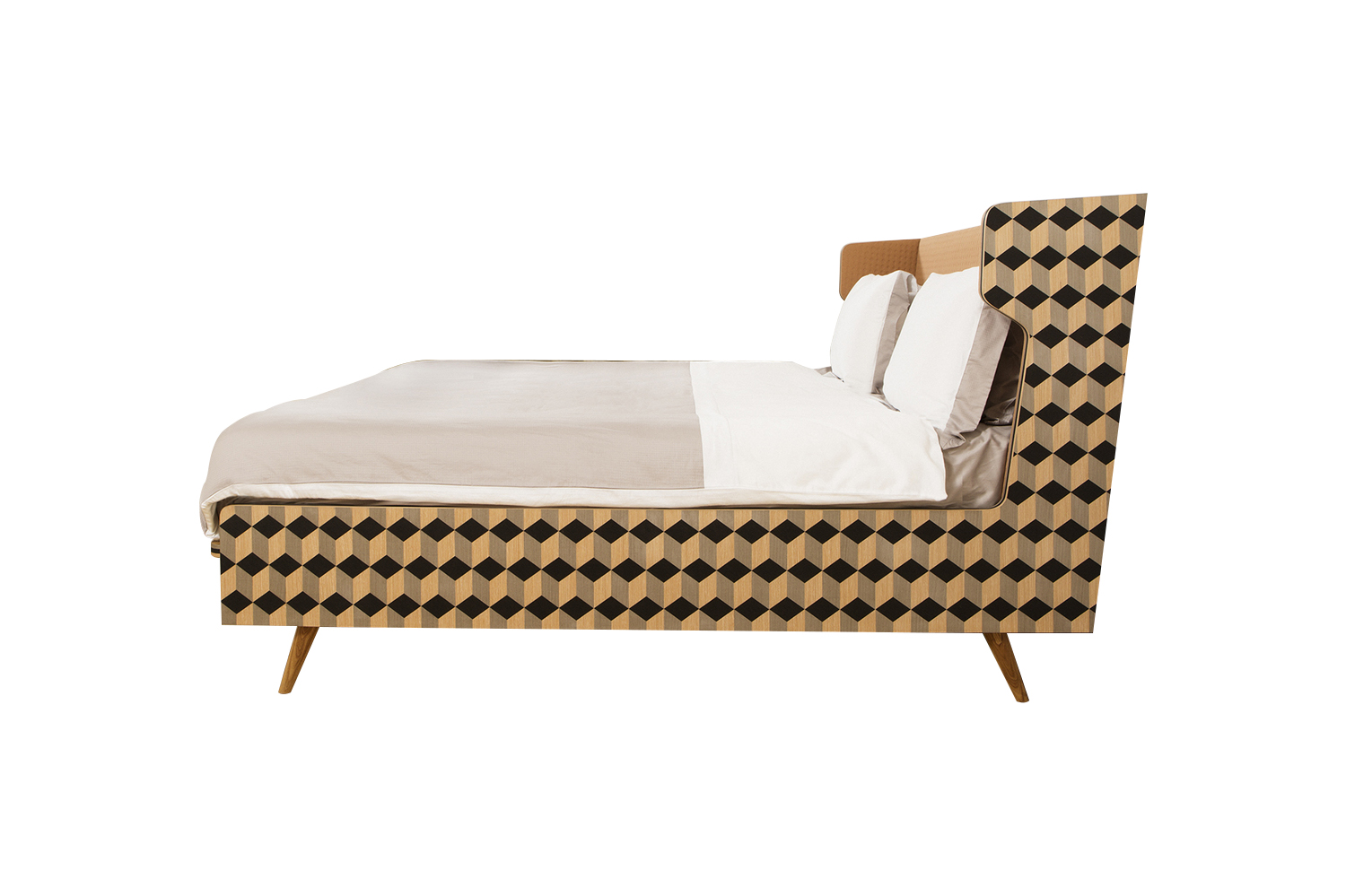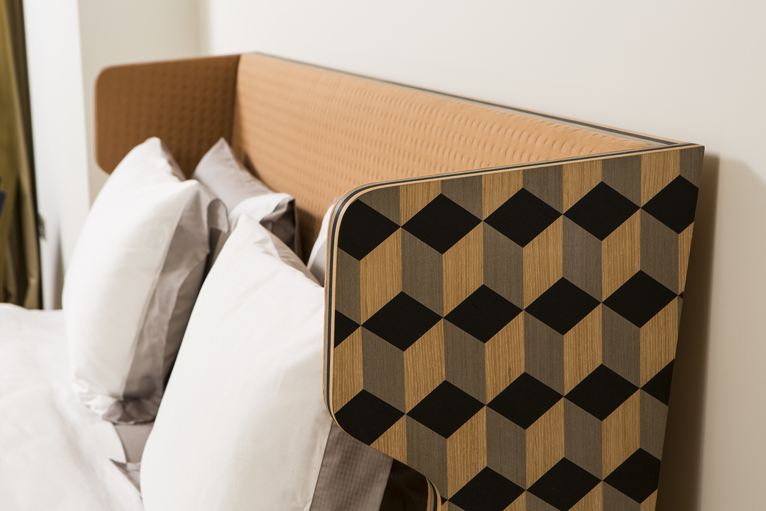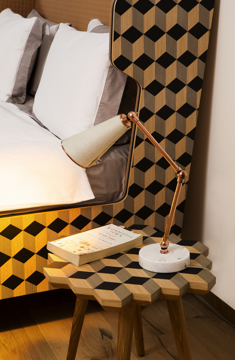 Dip Bed是Dip Collection的新添加产品。使用与凳子相同的材料制作的;美国白橡木和三种不同颜色的木材单板和深橙色的Kvadrat室内装潢组合在床头板上使用。床的边缘上的3个彩色的线性细节被设计来完成侧面的图案。这件作品是由伊斯坦布尔有才华的工匠手工制作的,它的独特的美学外观让人感觉舒适。