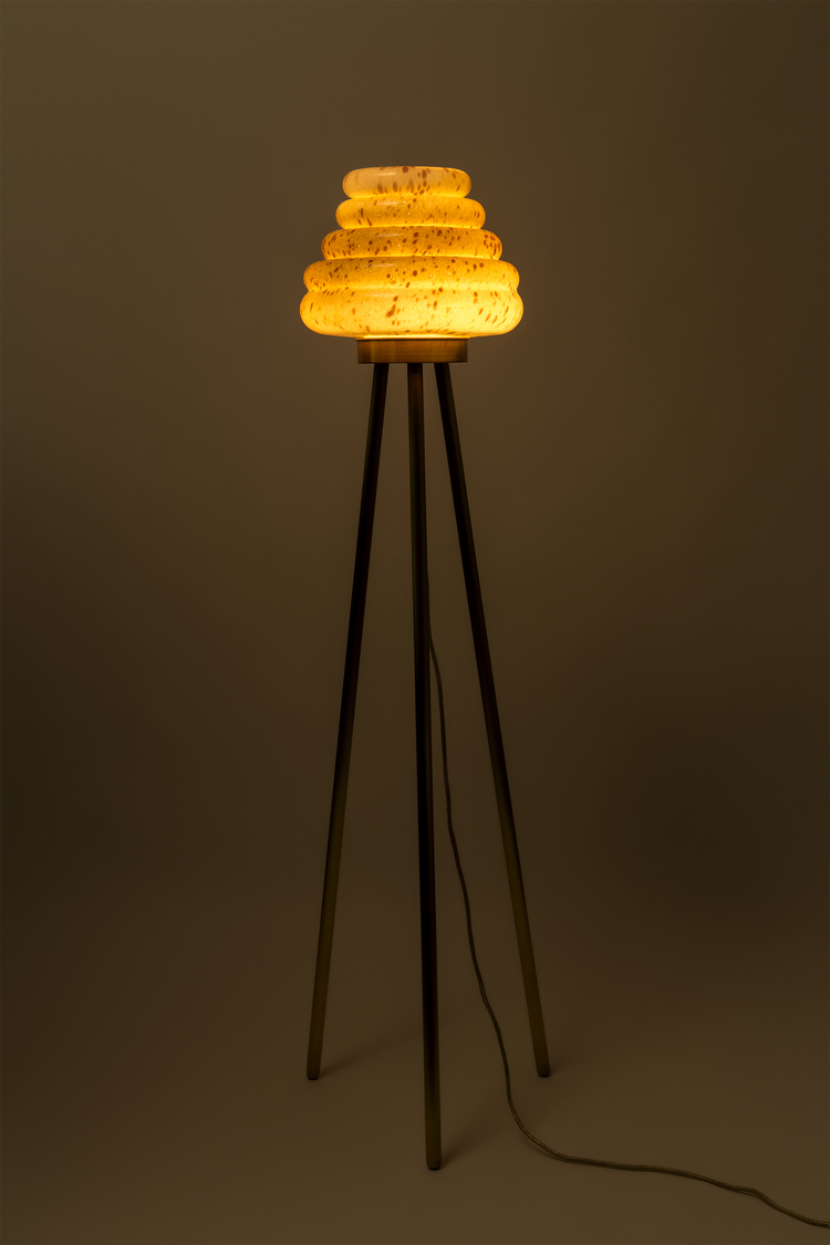 这款蜂巢式落地灯包括混合彩色手工吹制玻璃灯罩以及木质贴面腿和铜的不同组合。 第二个版本的Colmena有点缀图案的玻璃罩和哑光黄铜腿。 灯可通过调光器调节。 每件作品都是独一无二的,并定制。