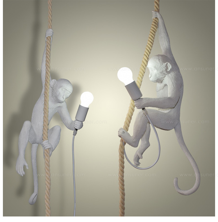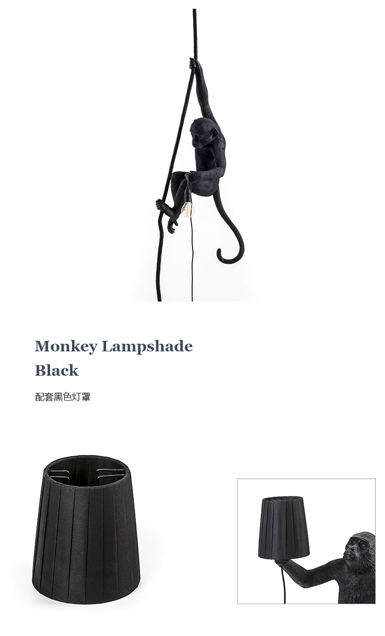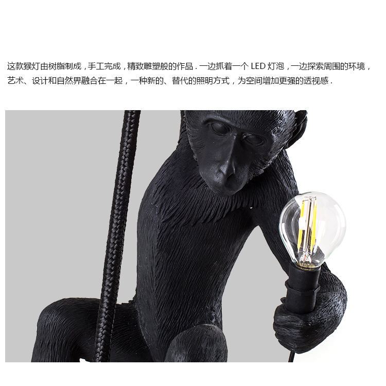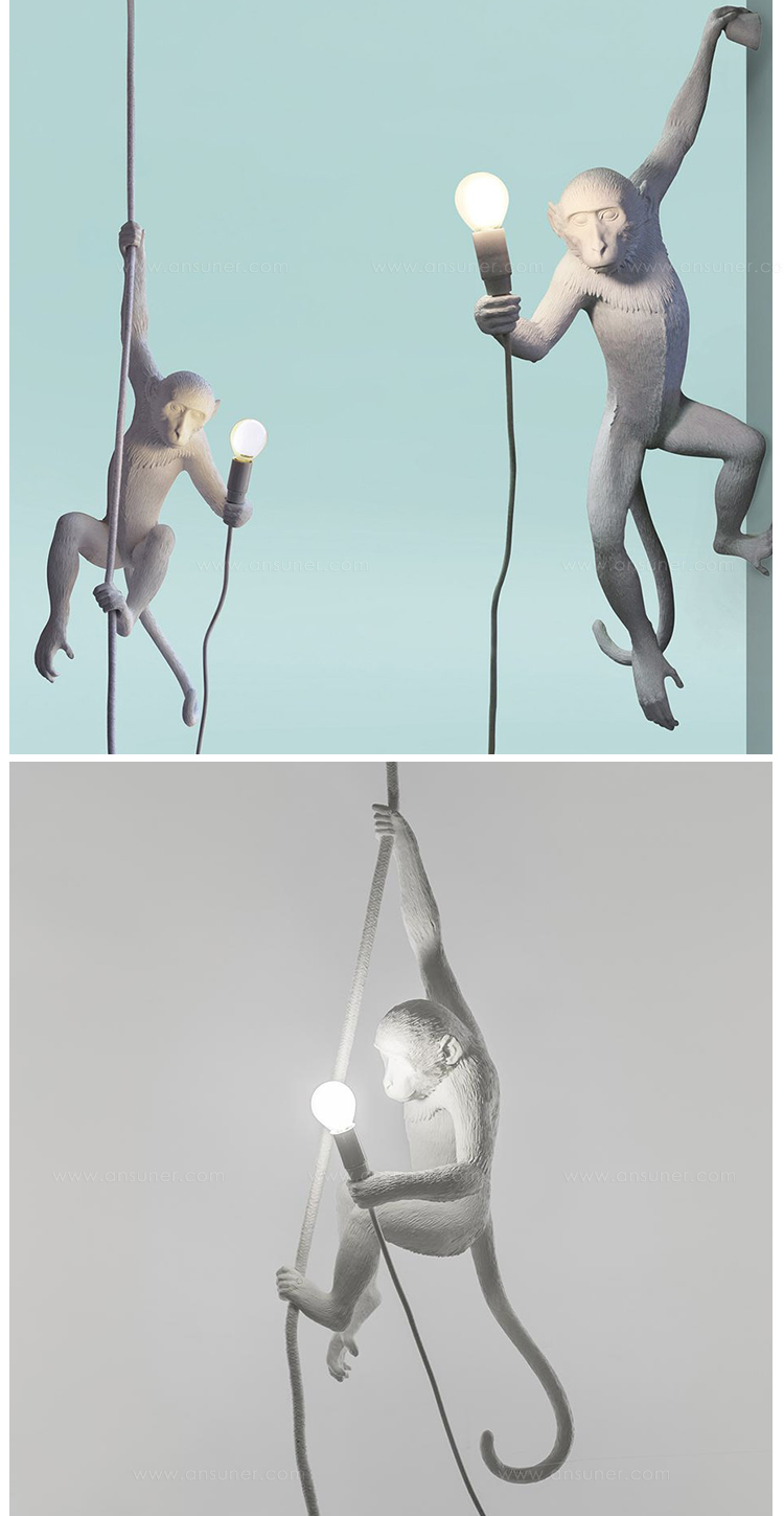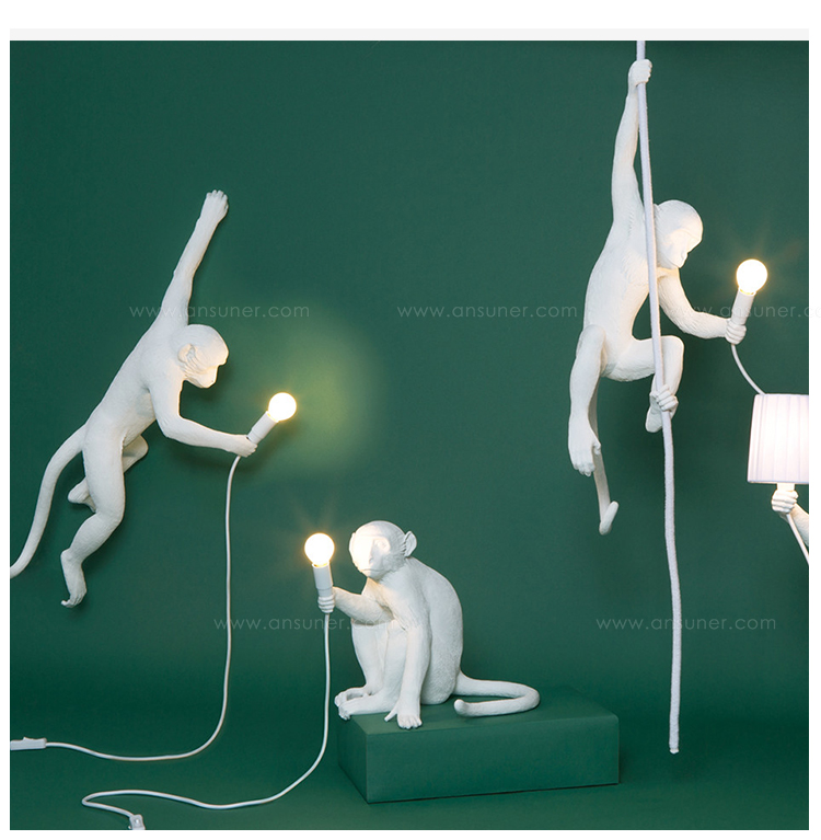 这款猴灯由树脂制成,手工完成,描绘了一只猴子在三个不同的位置,一边抓着一个LED灯泡,一边探索周围的环境,一种新的、替代的照明方式。
