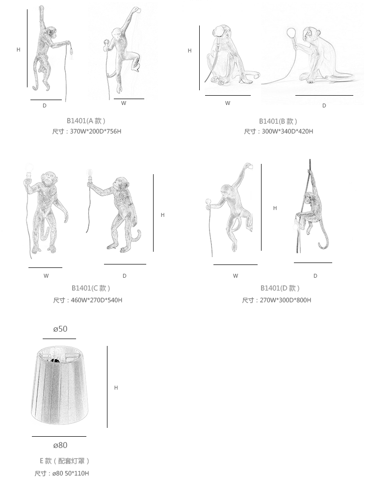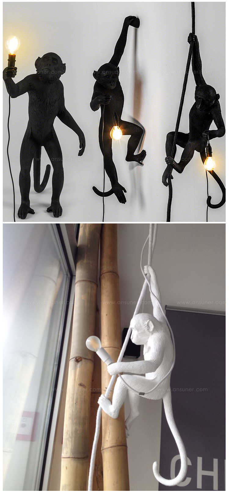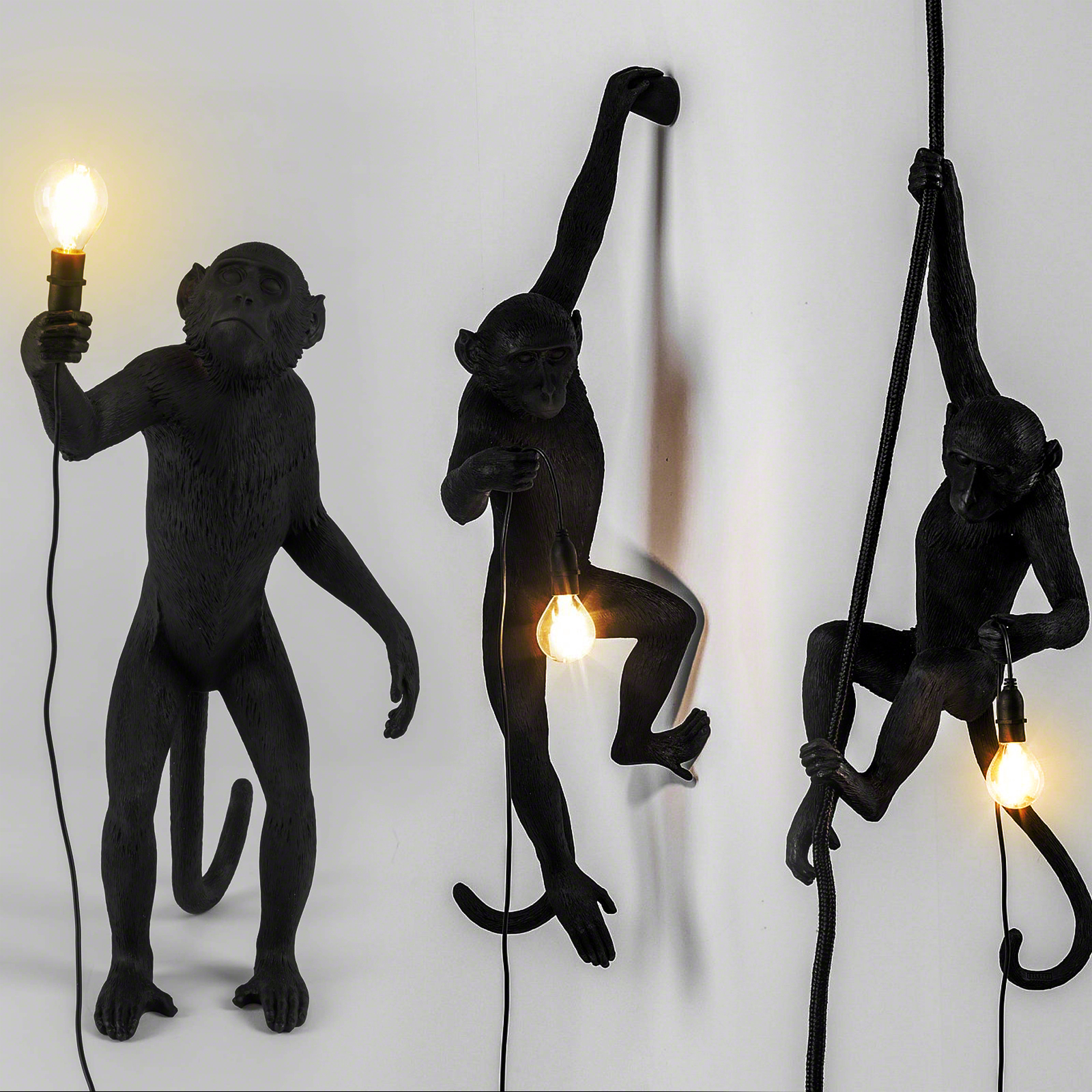 这款猴灯由树脂制成,手工完成,描绘了一只猴子在三个不同的位置,一边抓着一个LED灯泡,一边探索周围的环境,一种新的、替代的照明方式。