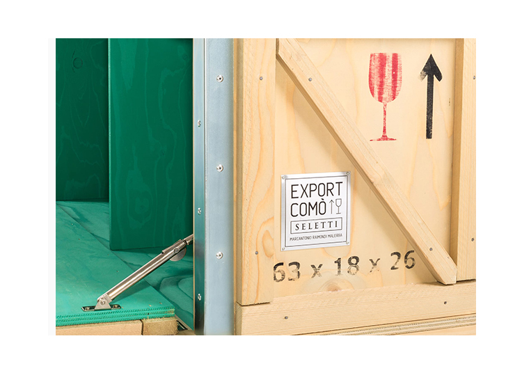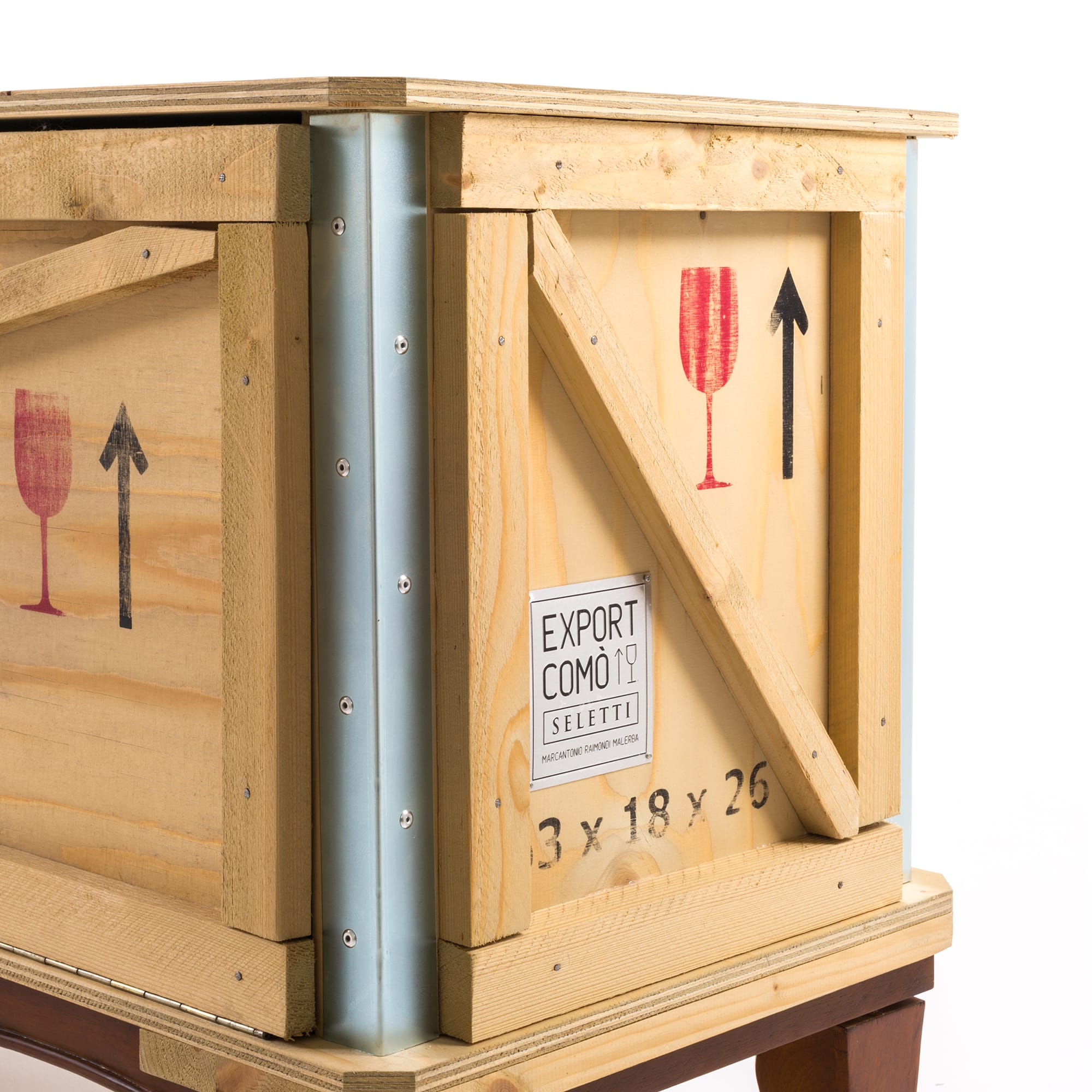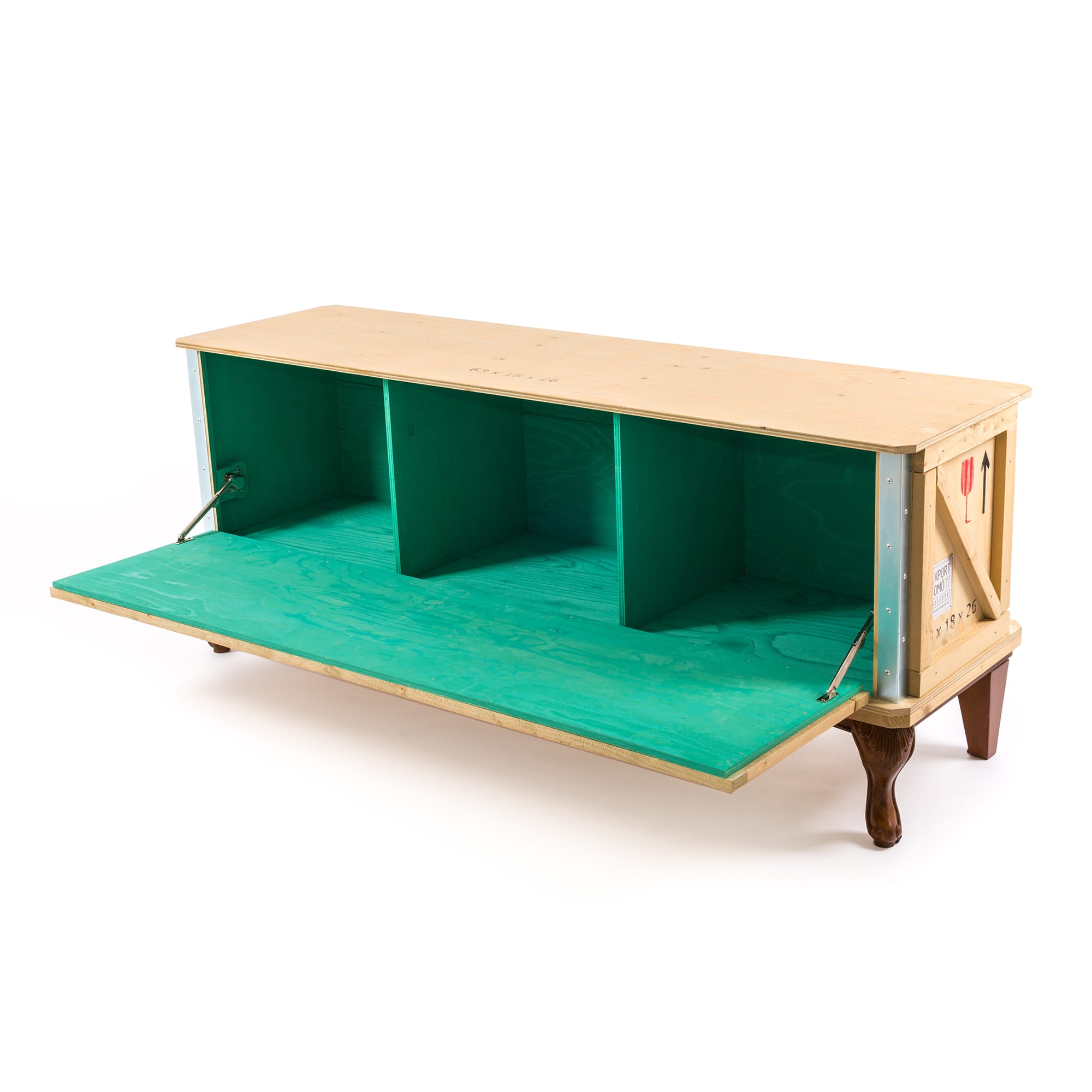 Designed by Marcantonio Raimondi Malerba for Seletti, this modern bedside table blends two different styles in one quirky design. A packing case boasting various labels and signs is paired with ornate Louis XIV legs. The bright green interior features one shelf and two storage spaces. Handmade from solid wood, this Export Como Bedside Table is as impressive in its durability as it is in its distinctive design. It can be used on its own to create a focal point in a bedroom or alongside other pieces of furniture from the Export Como collection. Made in Italy.