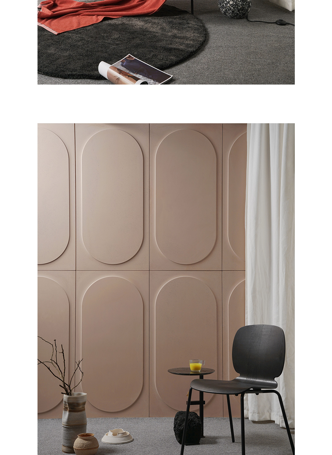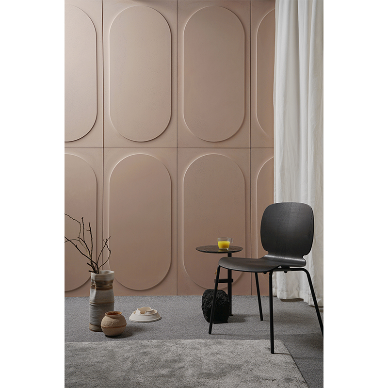 O从方与圆直线与曲线平面与弧面之间构建一种对偶关系,从罗马斗兽场建筑中得到启发,用当代的设计语言形式进行诠释,一个圆象征着一个空间一种视角展开想象,从不同视角中看到自我的认知和理解; 圆从方中向外凸起形成正负形的立体空间,从建筑室外走向室内,在空间中与声音空气阳光产生关系,有形和无形的交织富有装饰性和想象力;