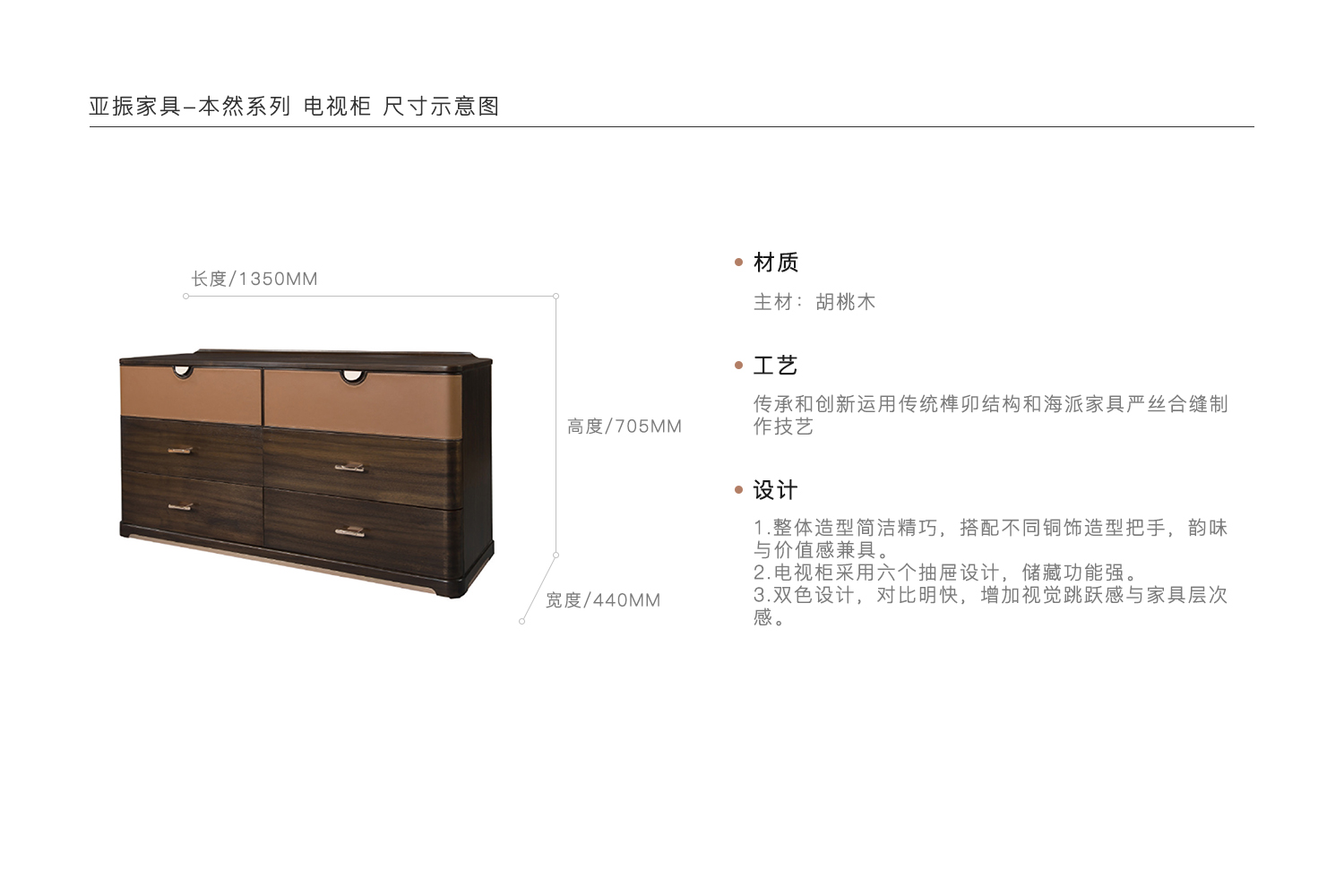 1.整体造型简洁精巧,搭配不同铜饰造型把手,韵味与价值感兼具。 2.电视柜采用六个抽屉设计,储藏功能强。 3.双色设计,对比明快,增加视觉跳跃感与家具层次感。