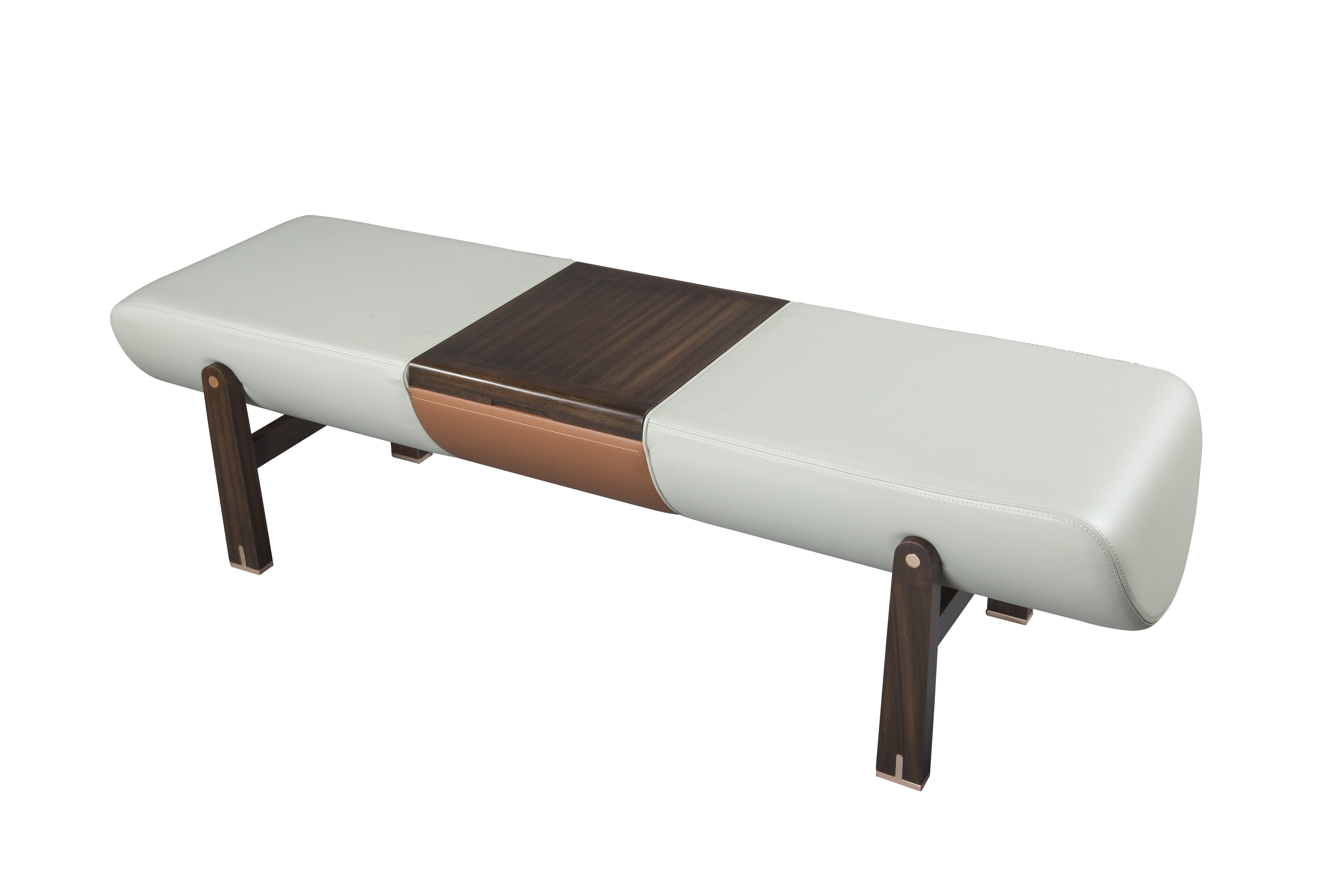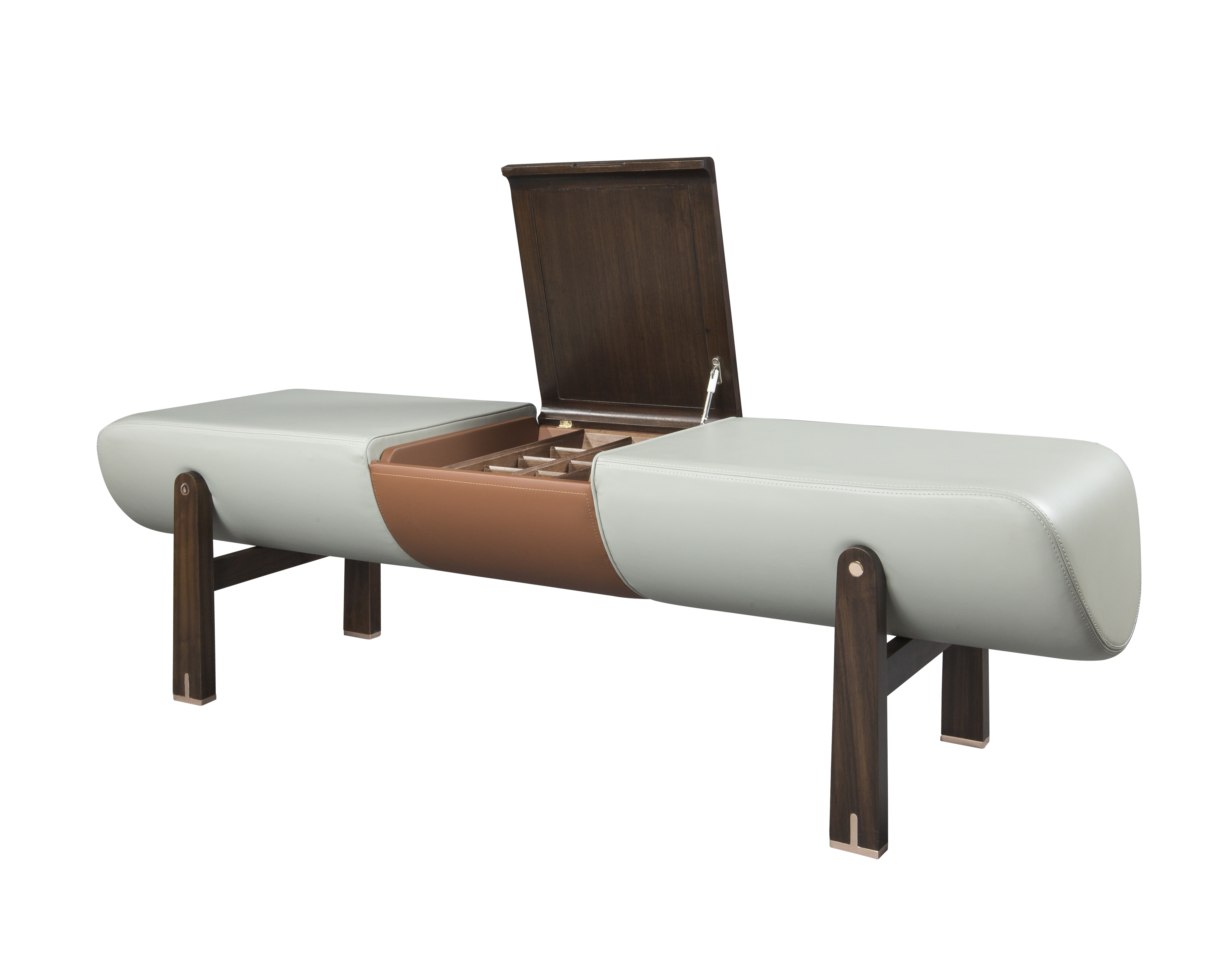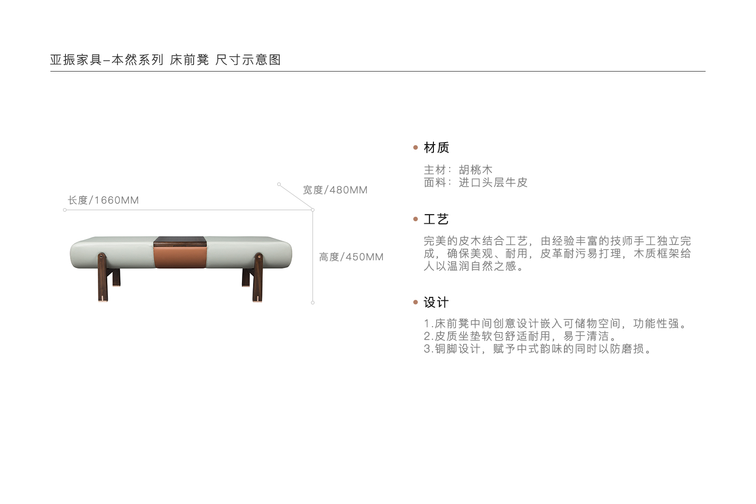 1.床前凳中间创意设计嵌入可储物空间,功能性强。 2.皮质坐垫软包舒适耐用,易于清洁。 3.铜脚设计,赋予中式韵味的同时以防磨损。