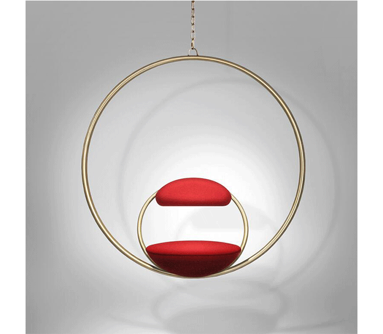 "Suspended from above,two brass plated steel circular hoops join to create the Hanging Hoop Chair,with a seat and backrest upholstered in Kvadrat wool.Also available in a satin black finish."