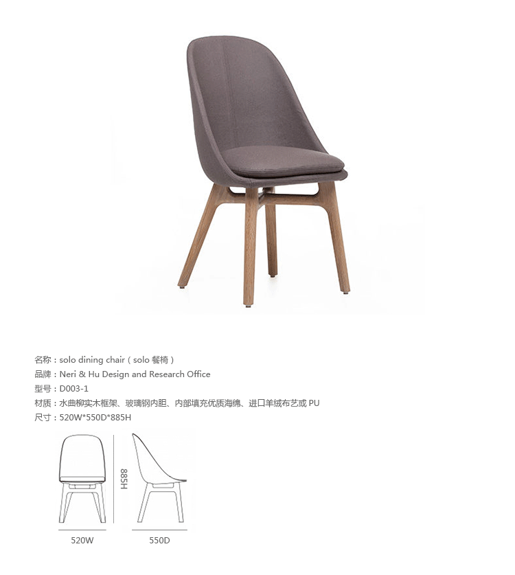 Solo Dining Chair(Solo餐椅)是Neri & Hu工作室设计的作品,设计灵感来着伊姆斯夫妇设计的贝壳椅,Solo椅将伊姆斯夫妇标志性的贝壳椅重新设计的更加精致、舒适,适用在家具和商业。Solo椅有柔软的外壳,舒适的人体工学,更注重私人空间,看起来更加独立于周围环境,使人有种神秘感。