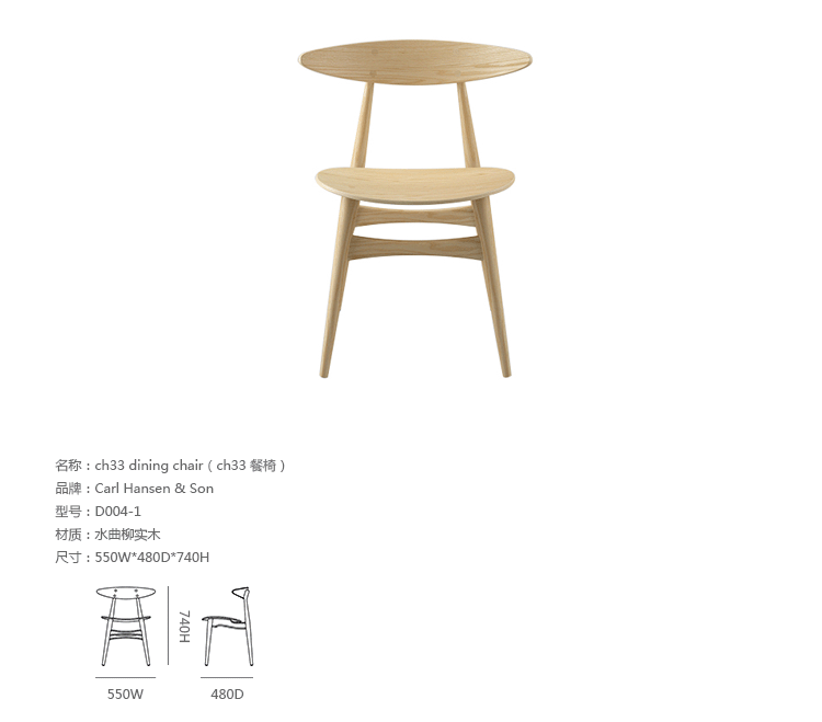 "CH33 dining chair(ch33餐椅)由Hans Wegner设计于1957年,是其总多经典座椅之一。CH33餐椅轻巧的同时兼顾了座椅舒适度的与坚固度。其拥有着50、60年代的简约线条,座垫部份可选择增加皮革或布料软垫.主体更可随意搭配指定木料款式。CH33餐椅餐椅不仅仅是一把椅子,它更像一件艺术品,无论用在任何环境都非常的优雅气质,精良的手工制作更使它推向经典,流行至今,产生了一代又一代的拥趸者。