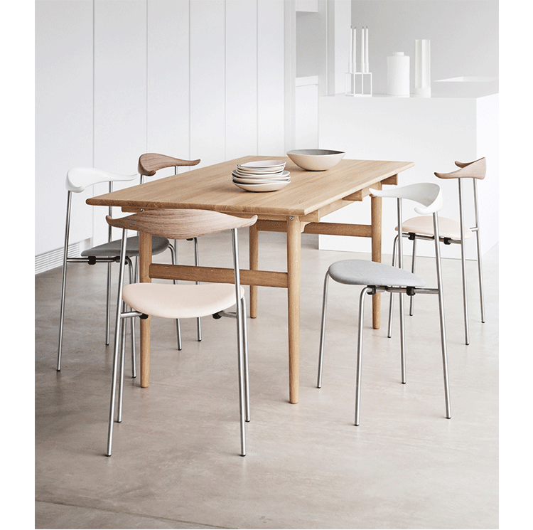 Wegner CH88 Chair,设计于1955年,不过当时没有马上生产。为了纪念大师的100年诞辰,Carl Hansen & Son公司正式启动这个项目并投入生产。蒸汽弯木技术的扶手结合椭圆木质座板以及不锈钢腿的混合材料使用使这把椅子的工业化设计感倍增。同时这把椅子也是可堆叠的,增加了多功能性。这款椅子无论外观还是实用性都做到极致,其中光洁度和框架显得多才多艺。上部结构设有蒸汽弯曲木靠背的背部支撑,靠背的两端有轻微弯曲的手臂,提供了一个自然休息的地方。钢架,直后腿,支撑一个椭圆形的木制座位。这种混合的材料,结合简约的设计,焕发出光、有机、工业的完美表达。