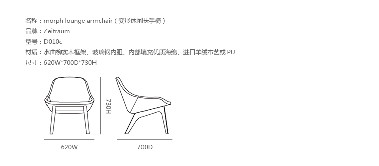 德国家具厂牌 ZEITRAUM 讲究的不仅仅是家具,它着重的是一种"生活态度",每件 ZEITRAUM 家具除了需具备实用、耐用、容易搭配的基本要件,更重要的是可以衬托用户与空间的个性,简约取代夸张花俏的线调,细腻精巧的做工低调传递设计师缜密的设计思维。ZEITRAUM 使用来自永续森林的落叶型硬木,表面以有机油/蜡涂装,完全不使用化学物质,让用户与家具在空间自由呼吸。具有高舒适性和稳定性的 Morph系列休闲椅,由丹麦设计工作室Formstelle设计,结合实木脚架搭配层压板椅座,其流畅且精致的外观造型,只需要一个很小的区域便能散发出简约低调的质朴美感。