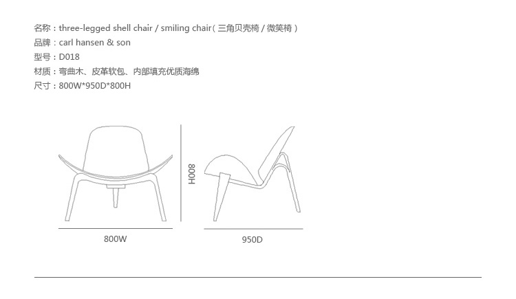 Wegner shell chair(三脚休闲椅)是由Hans J. Wegner设计的,椅子一共有三个脚,座椅像一个笑脸,又像胡子,设计师给他的编号为:CH07,外形现代、美观、独特,既可以有来看书读报,也可以用来休闲娱乐,成了20世纪最佳的设计之一。