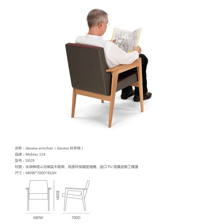 Danesa Armchair(Danesa 扶手椅)是一款北欧风格的扶手椅,适用于等候区、图书馆阅读室、医院或者行业区域。制作采用水曲柳或山毛榉实木框架、优质环保高密海绵、进口PU或真皮做工精湛。