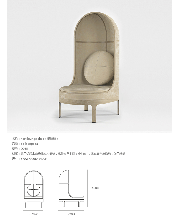 A unique seating experience.This lounge chair has a surrounding shell,making a cosy "nest" for the user.Nest keeps you close to your earliest memories.Whether placed in the middle of an immense desert or in a crowded lobby,Nest makes a statement.