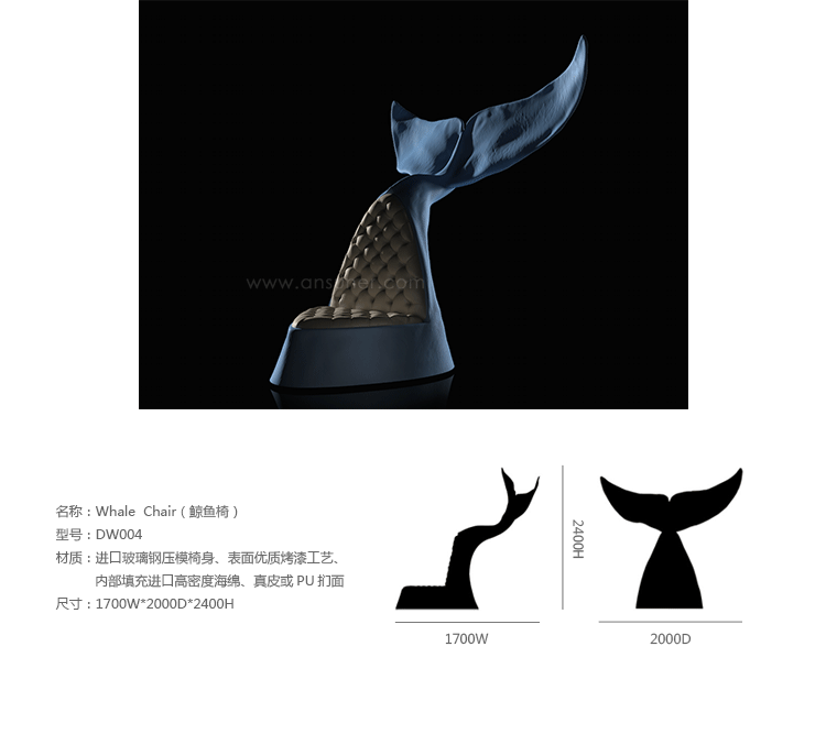 西班牙设计师 Maximo Riera 设计了一组包括章鱼、犀牛、海象、狮子等在内的 15 件动物造型座椅系列皮椅。这个系列的动物椅集合了不同的物种,从哺乳动物到爬行动物,甚至包括昆虫。每个设计都保留了动物的自然活力,同时又准确还原动物的外观特征。这些动物椅的初衷是一种尝试,希望以动物的栖息来反映和捕捉大自然的美,并向我们星球上的整个动物王国致敬。设计师除了表现动物的野性美,也在善意的提醒人们要维持生态的平衡,尤其对濒危物种多加关注,以实现人与自然的相互依赖和谐共存。Whale Chair(鲸鱼椅)是他之前一个系列家具作品的延续。这一系列作品将家具和动物结合到一起,每件家具的主要部件都装饰有一种动物。Whale Chair(鲸鱼椅)把我们带到海洋的深处,这头漂亮的海洋哺乳动物在这里拥有至高无上的统治权。由于该艺术家与海洋千丝万缕的联系,因此对他来说,这种对世界最大动物——蓝鲸——的致敬方式极其重要且具有深刻的意义。这个标志性的图标已被公认为动物王国和人类之间和谐的象征。同时,它还是生存和克服困境的坚强呐喊。鲸鱼椅是设计放置于室内中央的产品。它的的大小和尺寸非常适合放在开阔的空间和宽敞的区域。完全展开的鲸鱼两鳍之间采用了非对称设计。顶端部分向后倾斜,并从动态的角度来实现该作品的平衡匀称。这种鲸已濒临灭绝,因此至关重要的一点是,我们要将负责任、可持续捕鱼的重要性谨记于心,以减缓地球上海洋动物的继续减少。“恐惧源于无知”——赫尔曼·麦尔维尔《白鲸》。